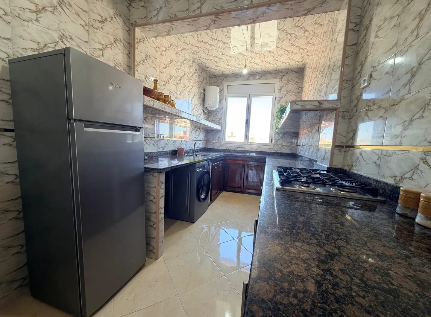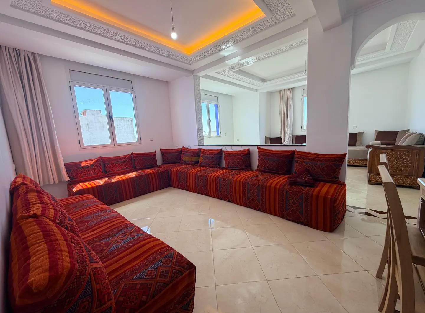 Au sein du Lotissement 5 à Essaouira, dans un environnement calme et recherché à proximité immédiate de la mosquée et des commodités, ce spacieux appartement meublé de 135 m² situé au troisième étage offre un cadre de vie harmonieux, idéal pour une location longue durée à Essaouira. Son agencement fluide et ses volumes généreux en font un bien particulièrement agréable à vivre.