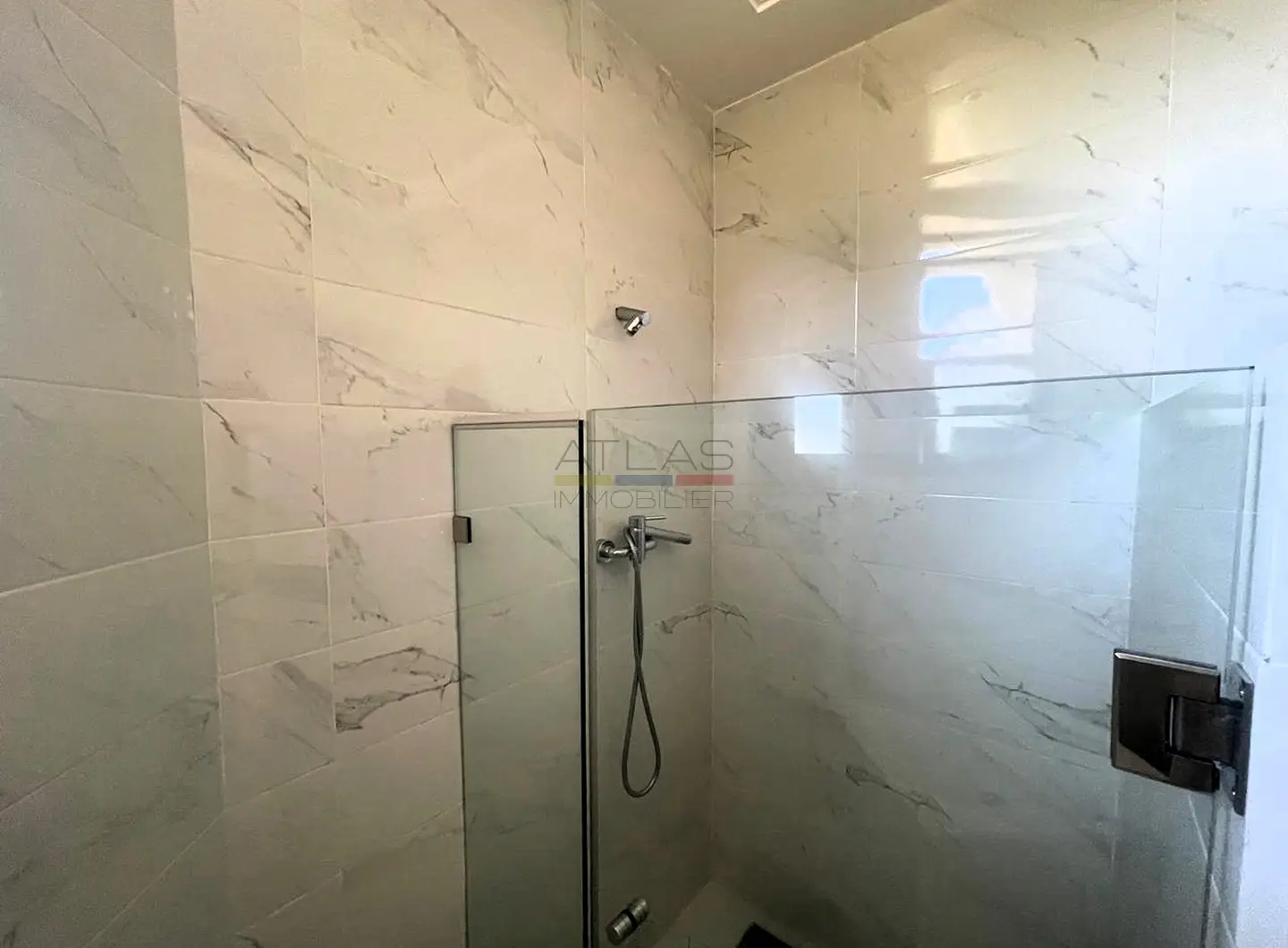 D’une surface habitable de 95 m², l’appartement comprend un vaste salon baigné de lumière, trois chambres avec placards intégrés, deux salles de douche avec toilettes, ainsi qu’une cuisine aménagée dotée d’un coin repas convivial. L’ensemble bénéficie d’une belle distribution des espaces, favorisant la fluidité et la clarté.