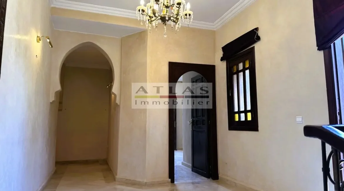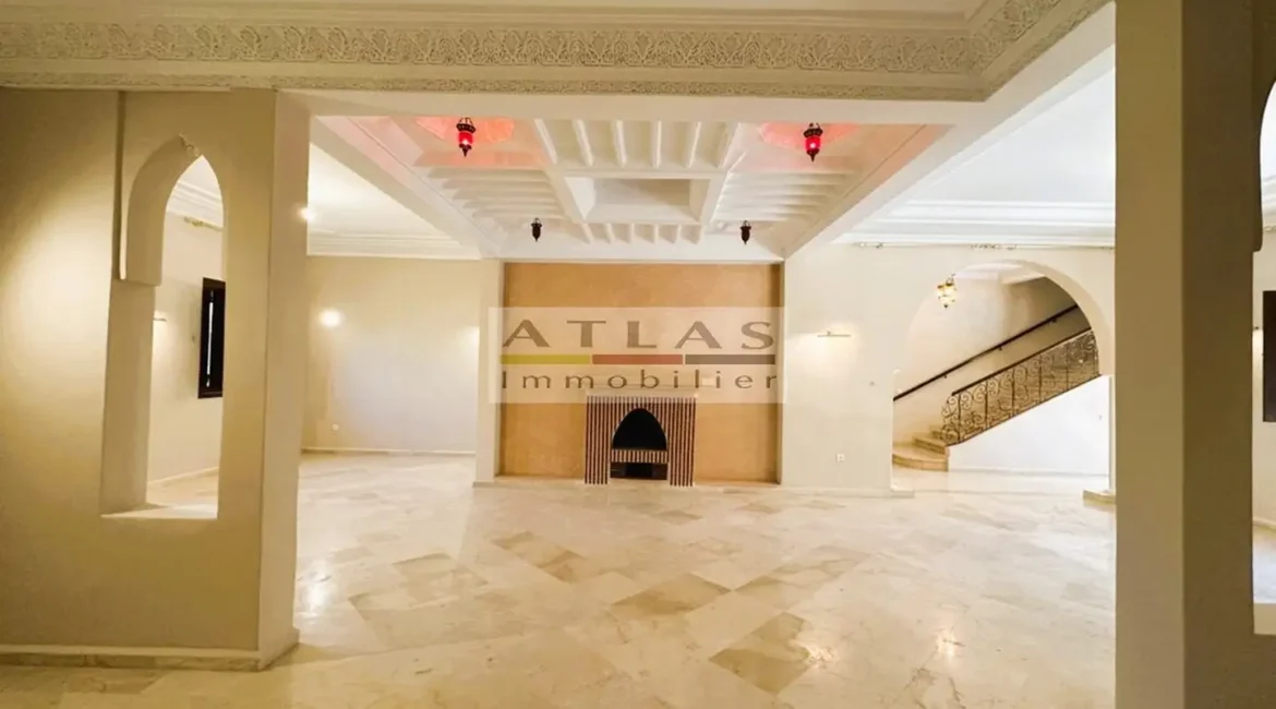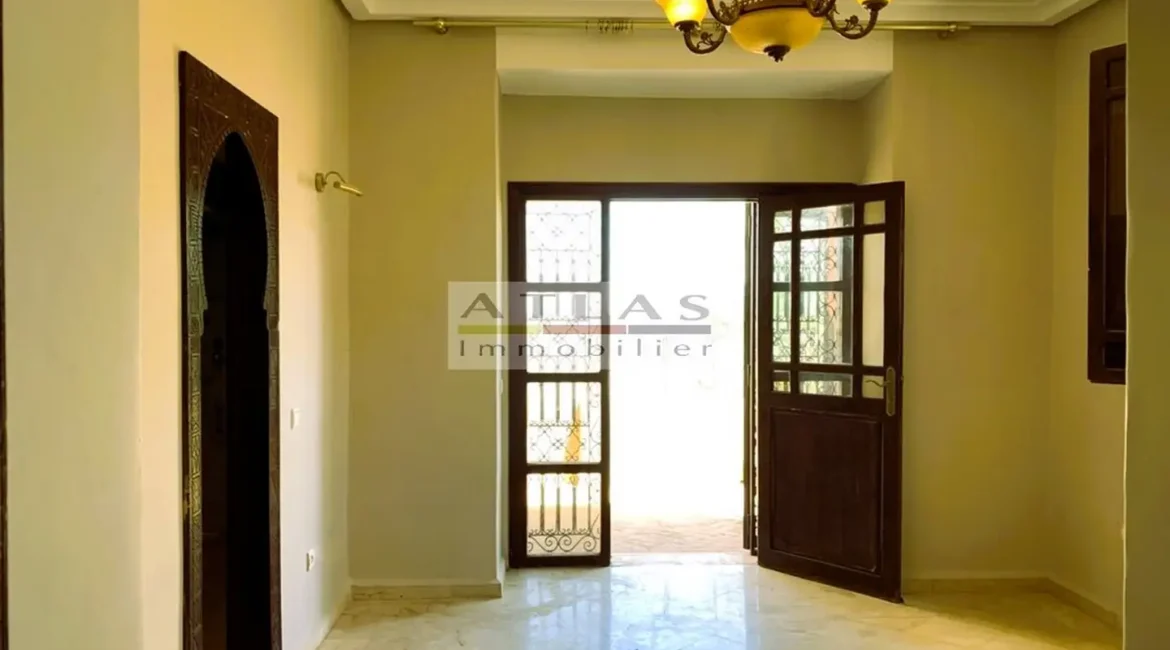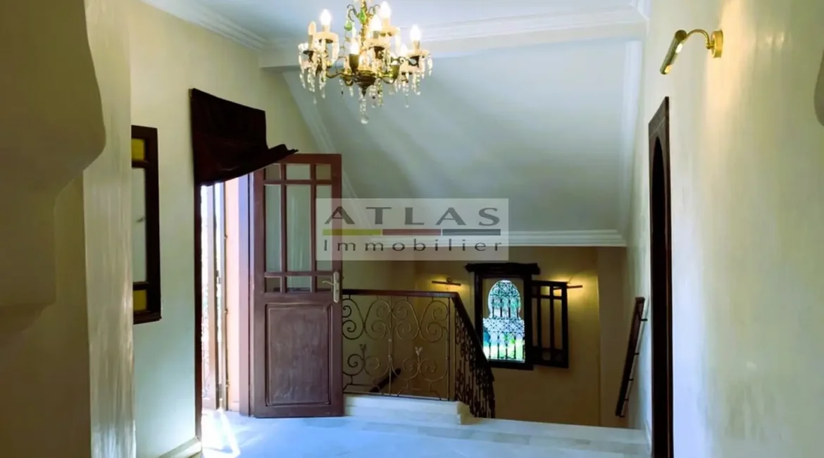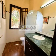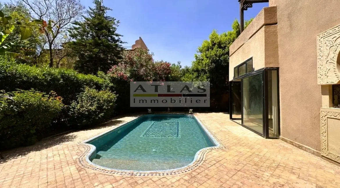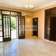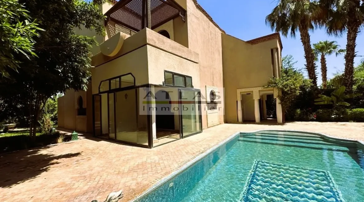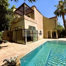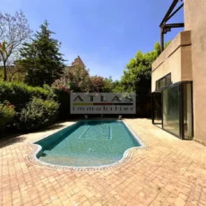 Découvrez cette superbe villa indépendante, située à moins de 15 minutes du centre de Marrakech, dans une petite copropriété calme et familiale. Offrant un cadre de vie paisible et raffiné, cette propriété exceptionnelle se distingue par ses espaces généreux et sa piscine privée. Le rez-de-chaussée se compose d’un vaste espace de vie divisé en trois parties, baigné de lumière naturelle et ouvert sur un jardin luxuriant ainsi que sur la piscine. La cuisine séparée, équipée d’une arrière-cuisine et d’un espace dédié au personnel, allie à la fois praticité et confort. À l’étage, quatre suites spacieuses vous attendent, dont deux avec terrasses offrant une vue imprenable sur les environs. Idéale pour une famille en quête de confort ou pour un investissement locatif, cette villa combine élégance, tranquillité et proximité de Marrakech.