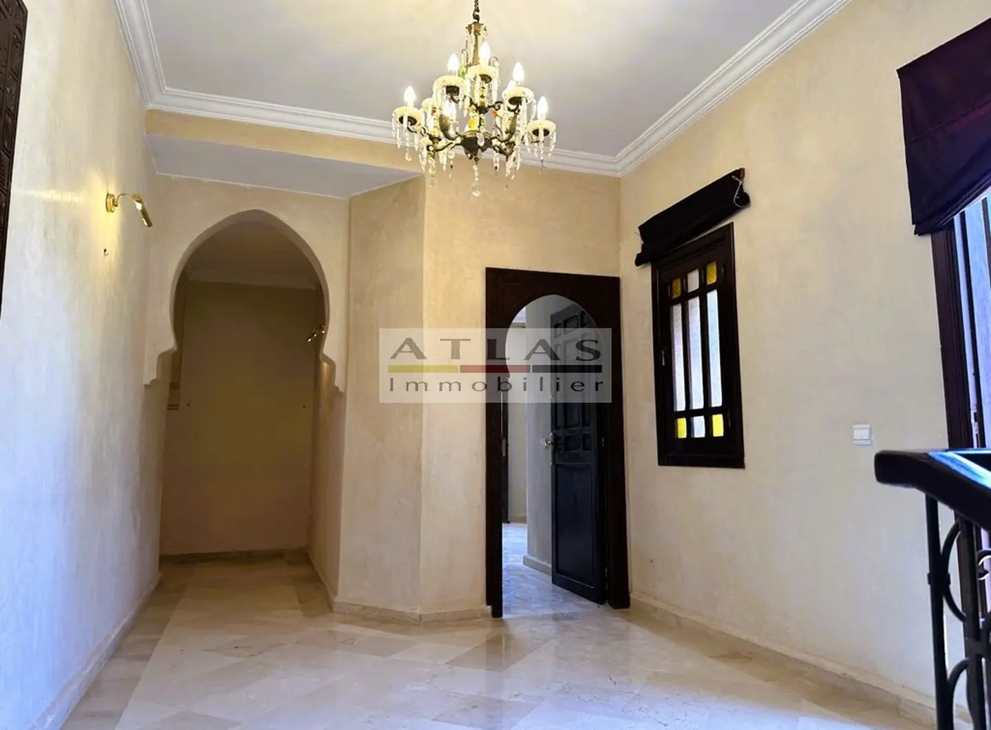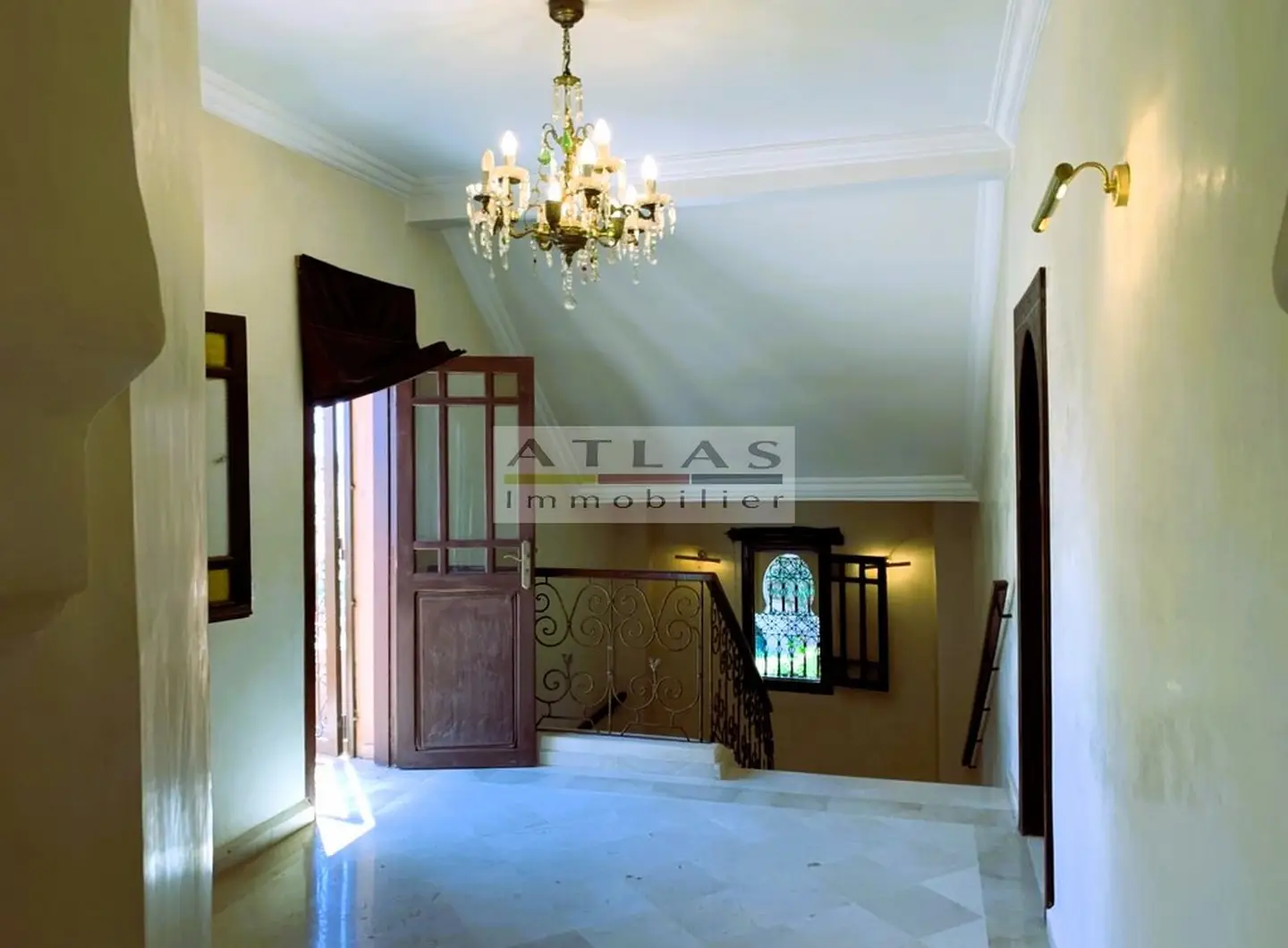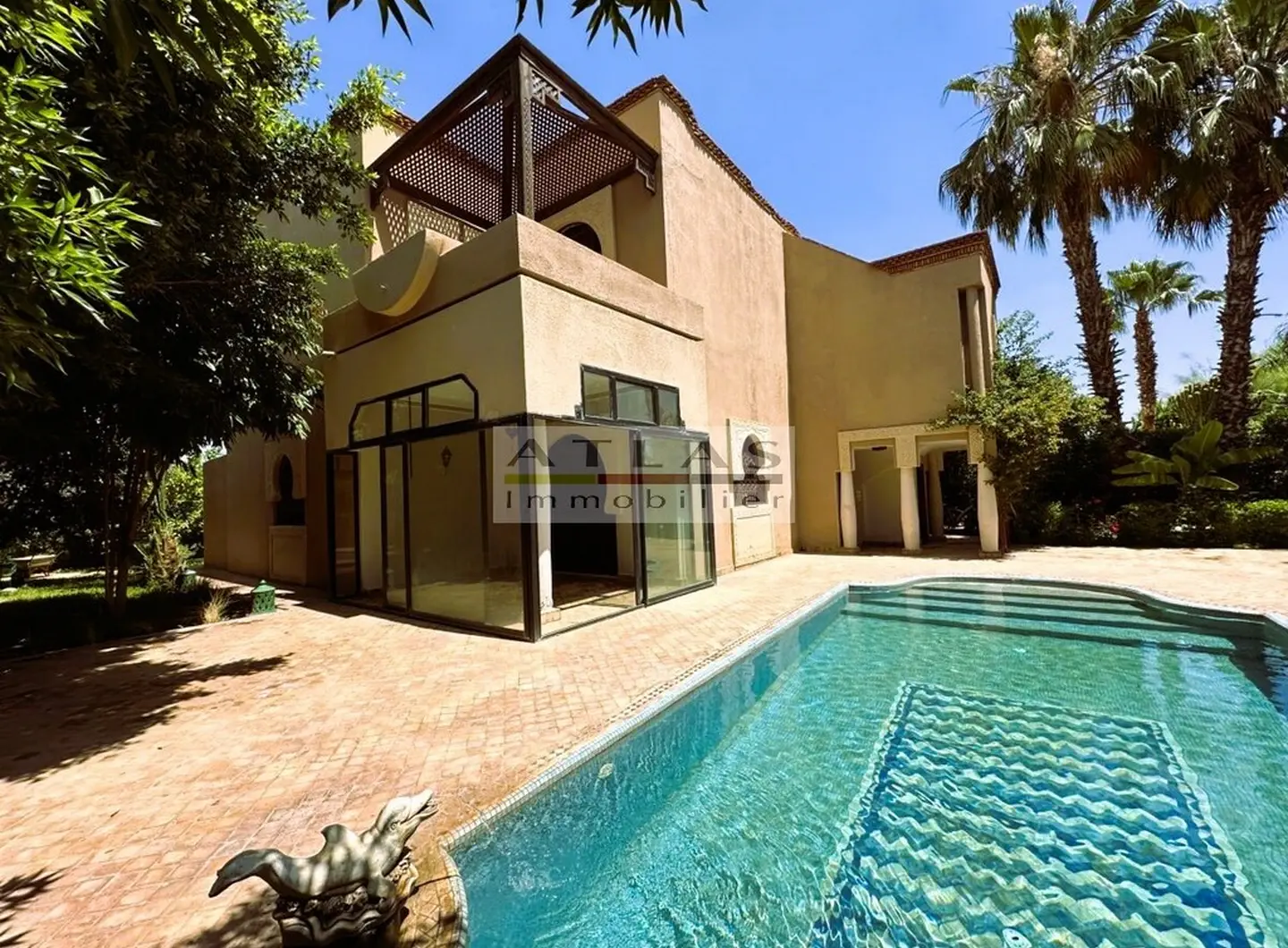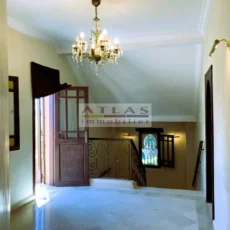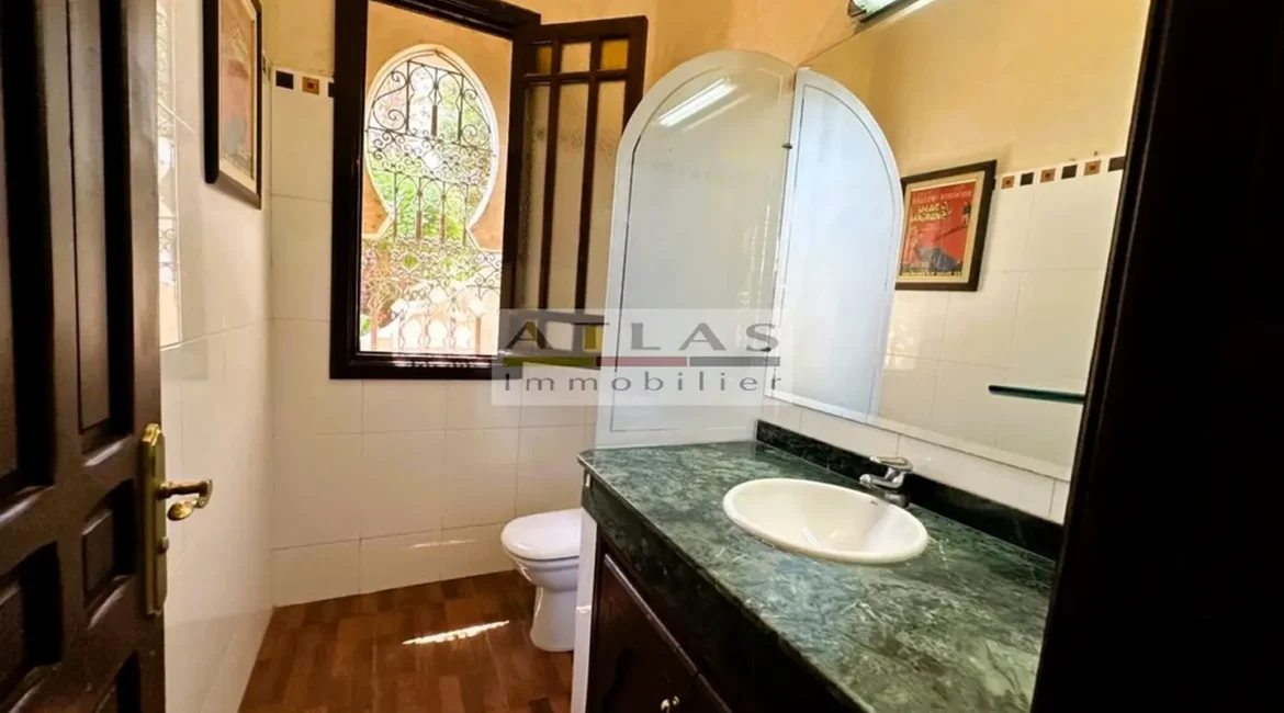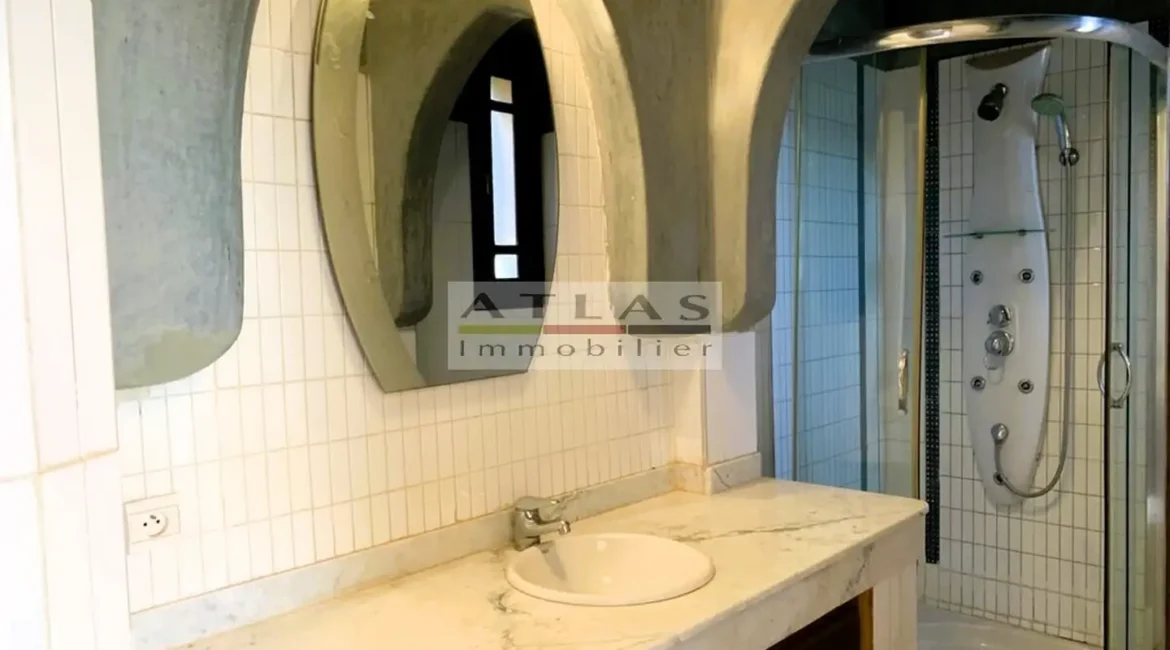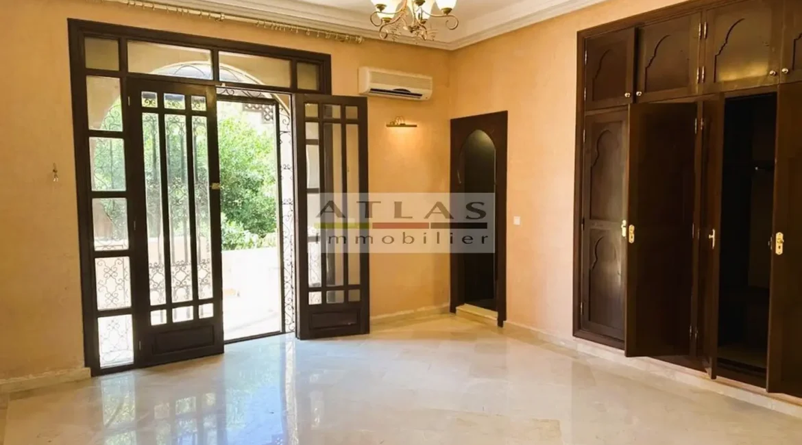 Découvrez cette superbe villa indépendante, située à moins de 15 minutes du centre de Marrakech, dans une petite copropriété calme et familiale. Offrant un cadre de vie paisible et raffiné, cette propriété exceptionnelle se distingue par ses espaces généreux et sa piscine privée. Le rez-de-chaussée se compose d’un vaste espace de vie divisé en trois parties, baigné de lumière naturelle et ouvert sur un jardin luxuriant ainsi que sur la piscine. La cuisine séparée, équipée d’une arrière-cuisine et d’un espace dédié au personnel, allie à la fois praticité et confort. À l’étage, quatre suites spacieuses vous attendent, dont deux avec terrasses offrant une vue imprenable sur les environs. Idéale pour une famille en quête de confort ou pour un investissement locatif, cette villa combine élégance, tranquillité et proximité de Marrakech.