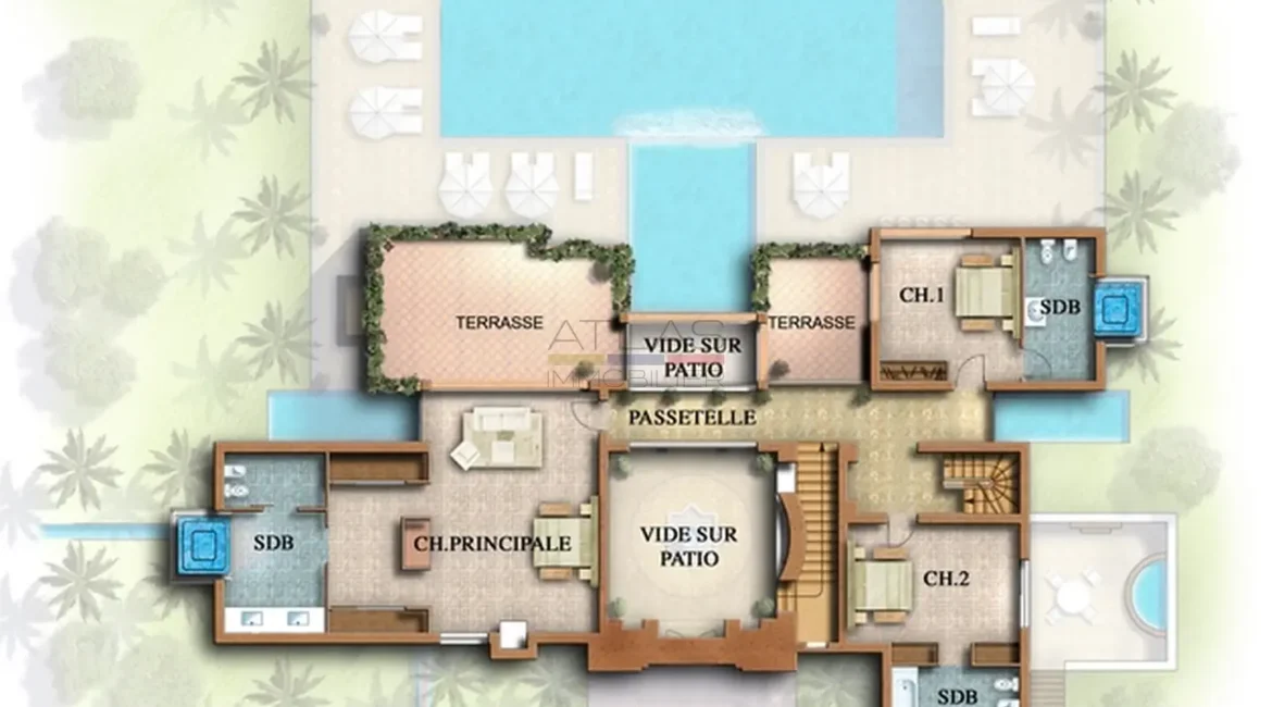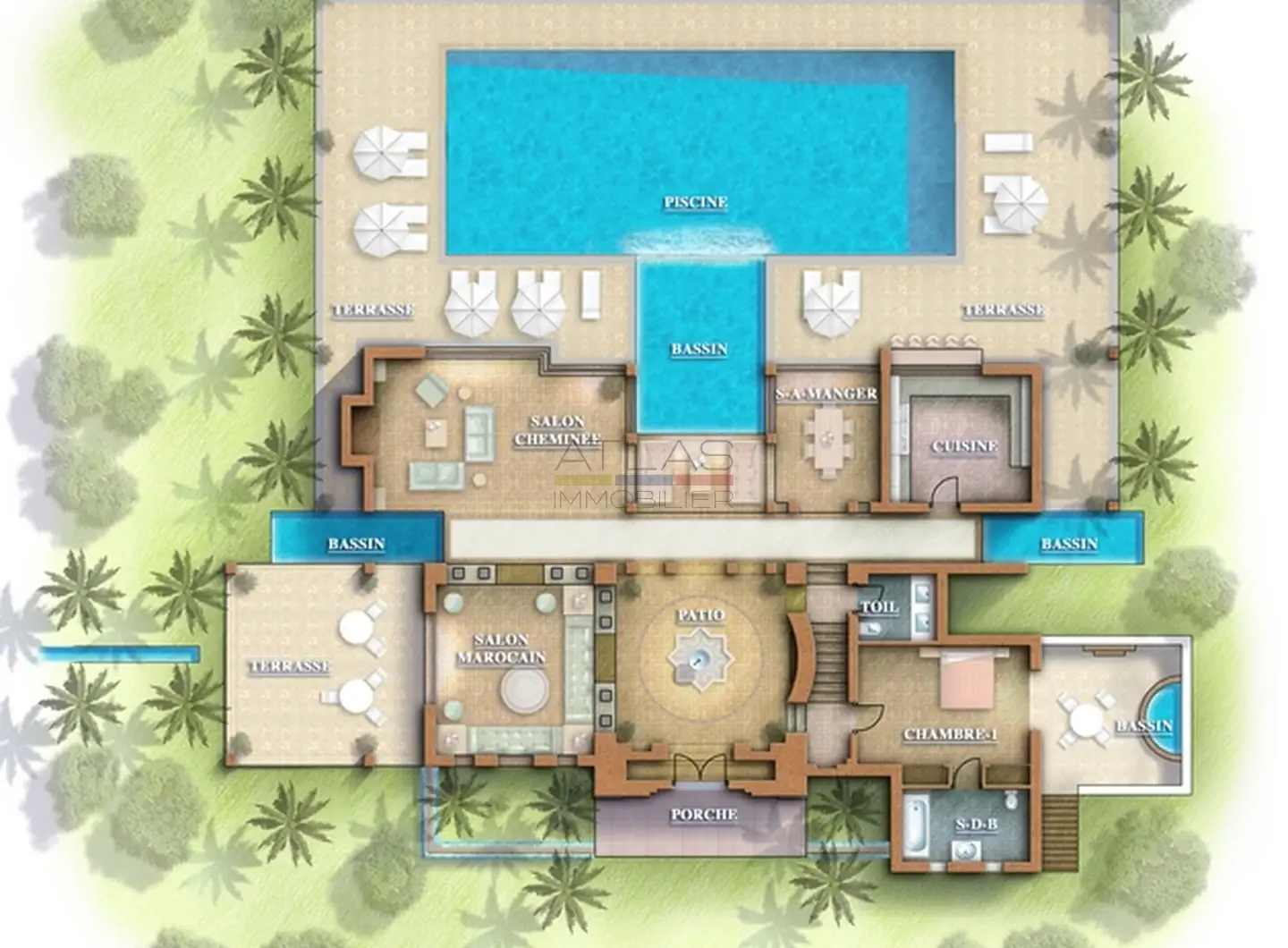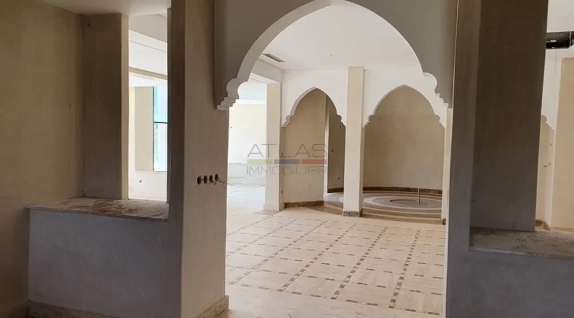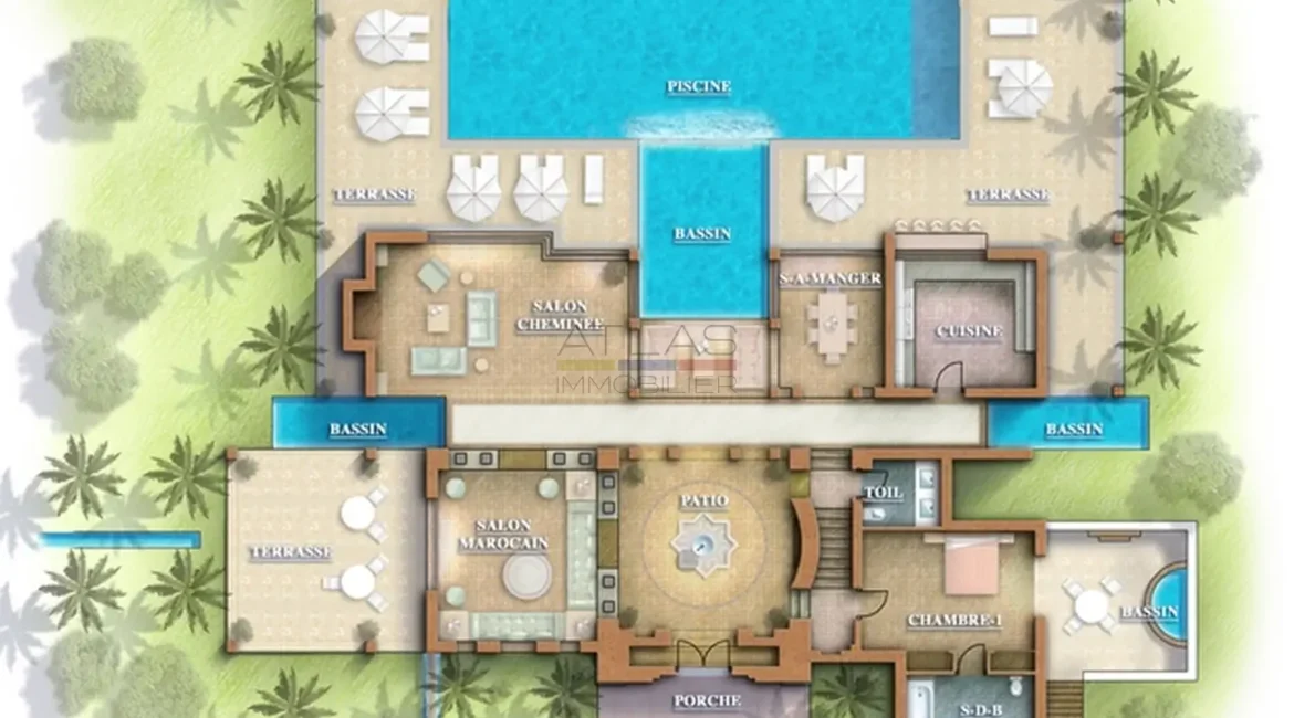 Pensée dans un esprit à la fois contemporain et traditionnel, cette villa offrait un cadre de vie exceptionnel. Le rez-de-chaussée s’articulait autour d’un patio andalou central, distribuant un double salon européen, un salon marocain, une cuisine équipée ainsi qu’un vestiaire avec toilettes. Une première chambre disposait de placards, d’une salle de bain et d’une terrasse privative.