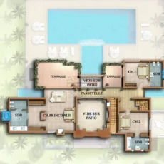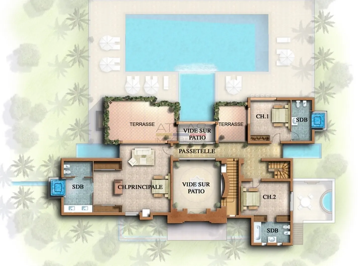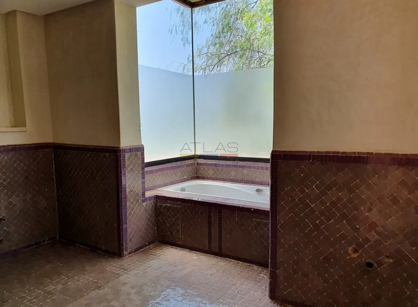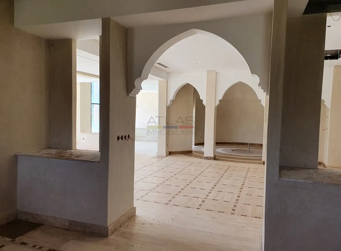 Pensée dans un esprit à la fois contemporain et traditionnel, cette villa offrait un cadre de vie exceptionnel. Le rez-de-chaussée s’articulait autour d’un patio andalou central, distribuant un double salon européen, un salon marocain, une cuisine équipée ainsi qu’un vestiaire avec toilettes. Une première chambre disposait de placards, d’une salle de bain et d’une terrasse privative.