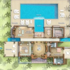 Le jardin, soigneusement paysagé de palmiers, d’oliviers et d’essences locales, accueillait une piscine de 12 x 5 mètres en vis-à-vis des baies vitrées de la villa. Une chambre pour le personnel, une buanderie et un local technique entièrement équipé contribuaient à la fonctionnalité de l’ensemble.