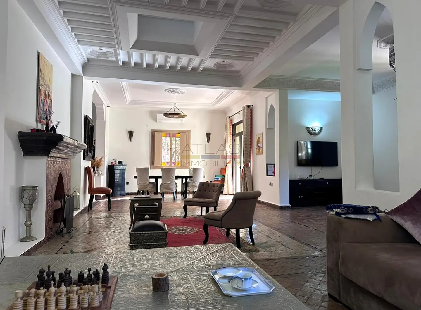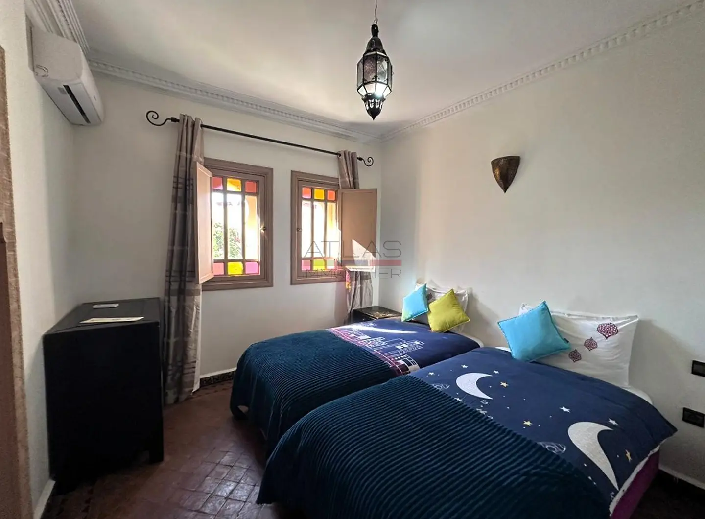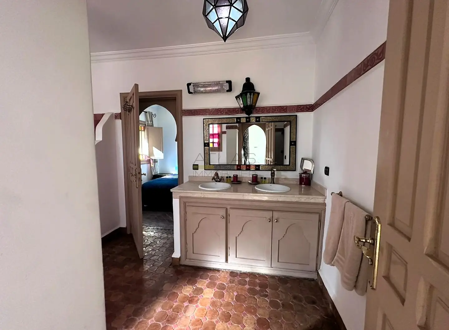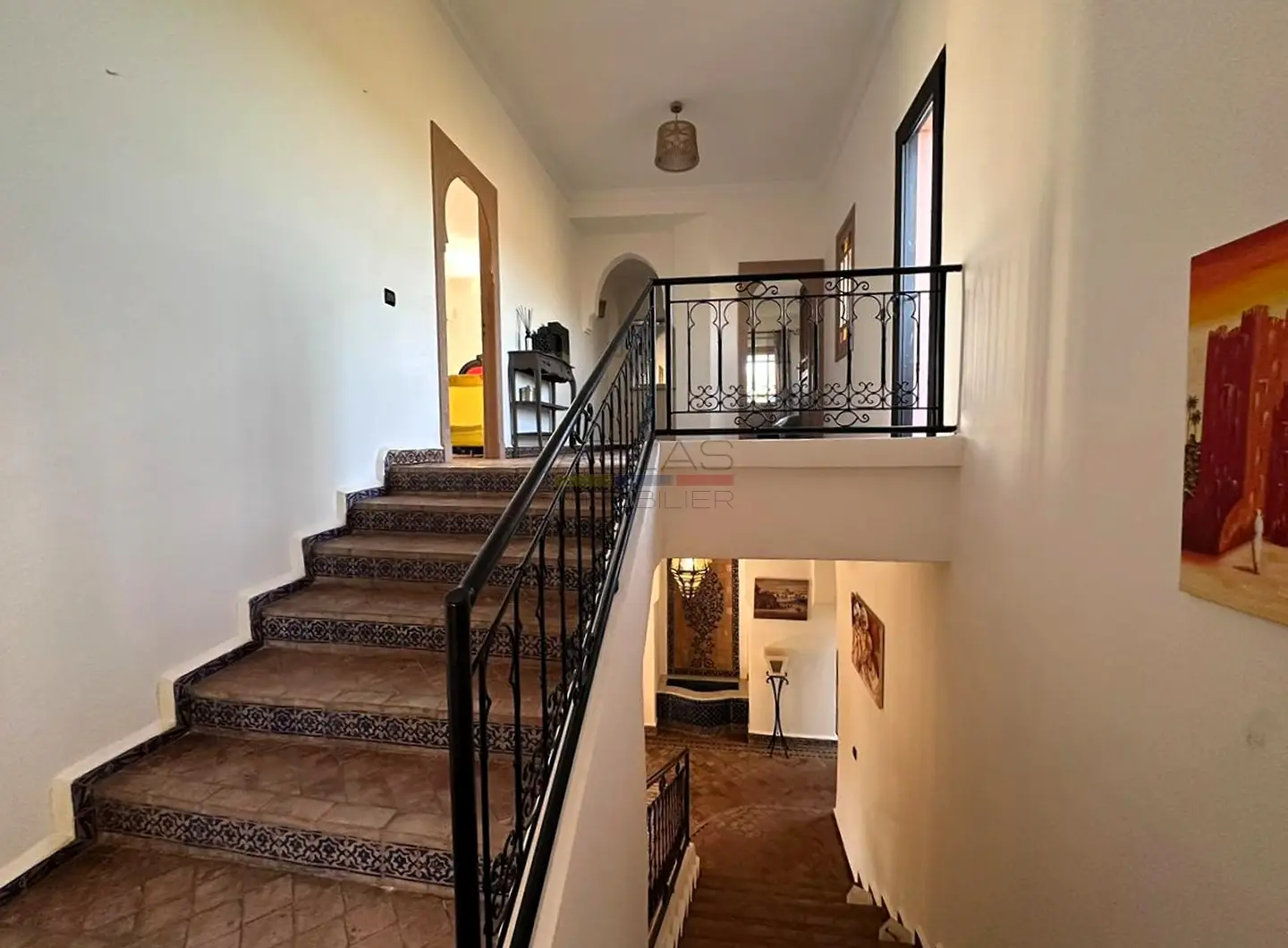 Située à seulement 15 minutes du centre-ville de Marrakech, sur la route de Ouarzazate, cette élégante villa individuelle de style arabo-andalou s’inscrit au cœur d’une résidence sécurisée à taille humaine, offrant un cadre de vie paisible et recherché. Implantée sur un terrain de 500 m², elle développe 220 m² habitables et séduit par son authenticité architecturale, ses matériaux nobles et ses finitions soignées, parfaitement adaptés à un projet de résidence principale, secondaire ou investissement immobilier à Marrakech.