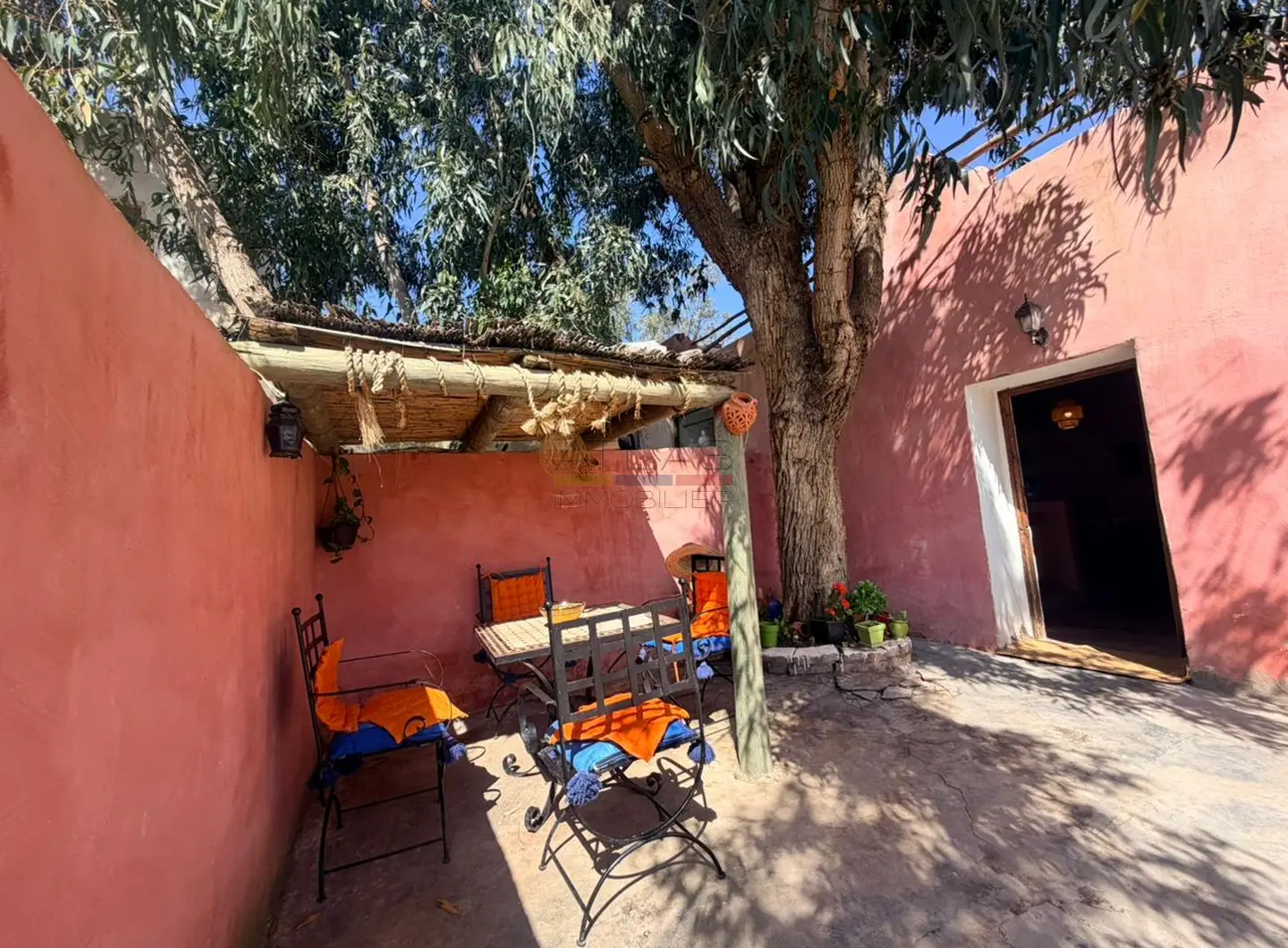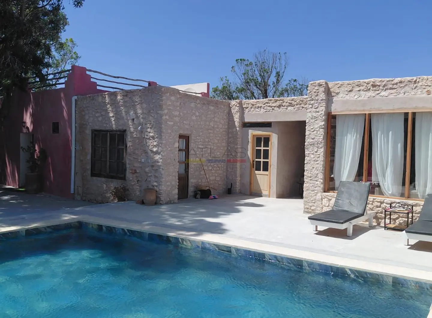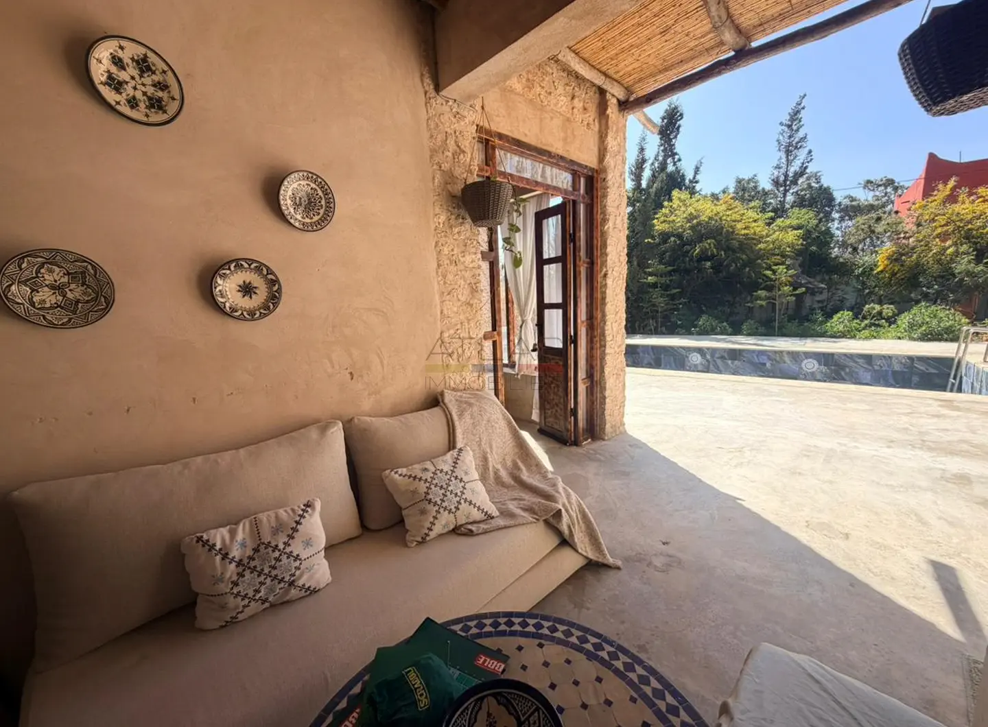 Les extérieurs sont un véritable atout, pensés pour profiter pleinement du climat doux d’Essaouira. La propriété dispose d’une piscine privée entourée d’un jardin arboré, d’une élégante pergola ainsi que d’un salon extérieur couvert, idéal pour se détendre ou partager des moments privilégiés en toute intimité. Un cadre rare pour une villa de vacances avec piscine à Essaouira.
