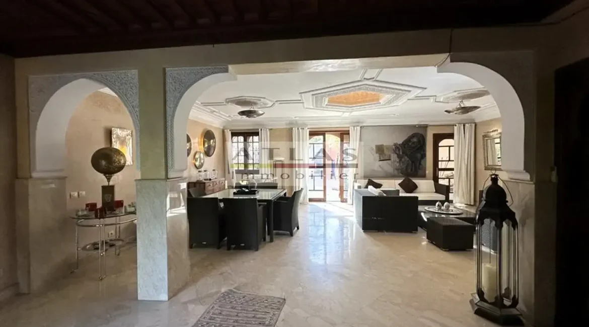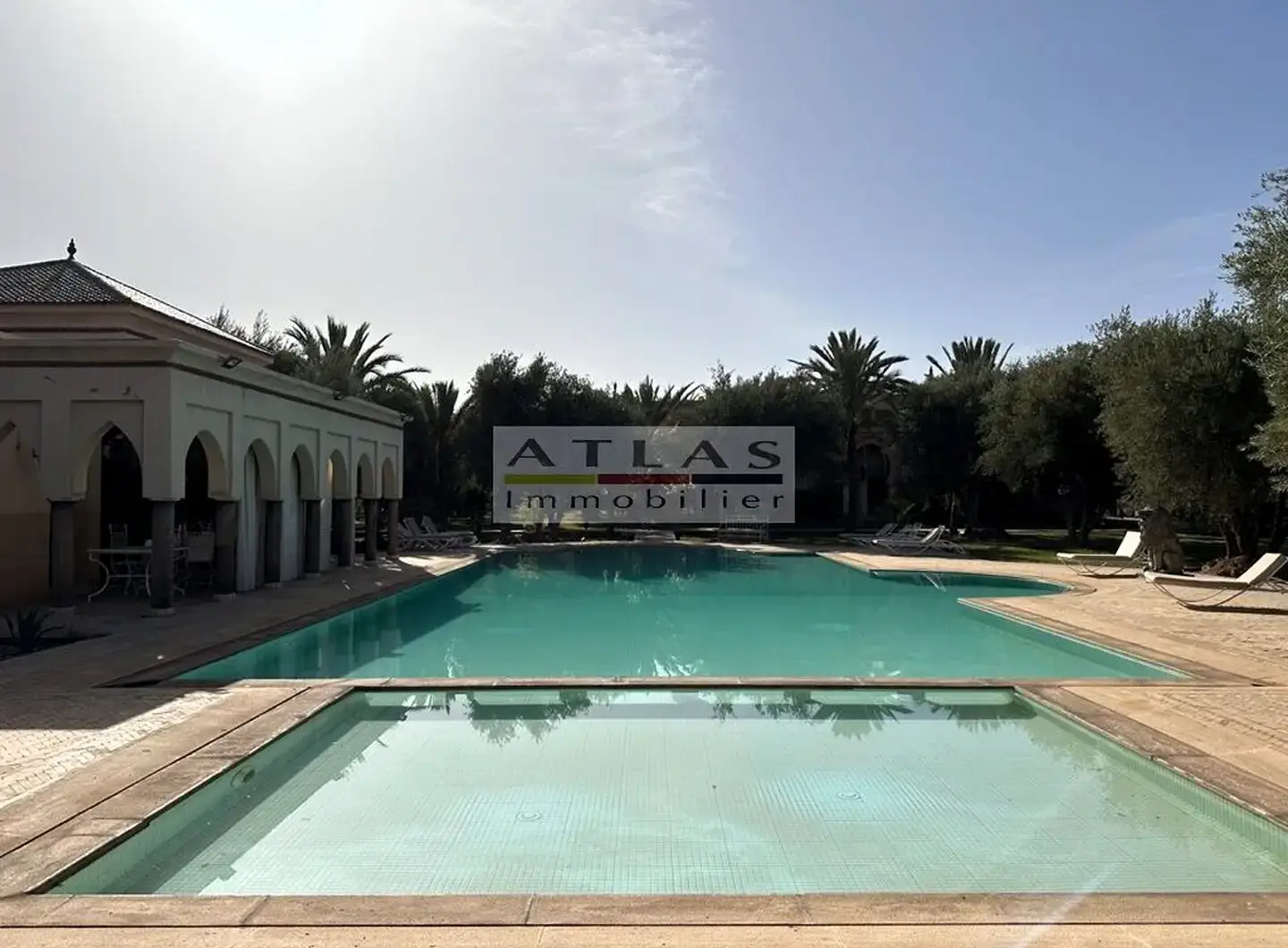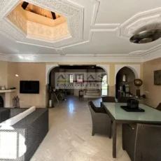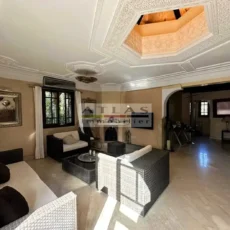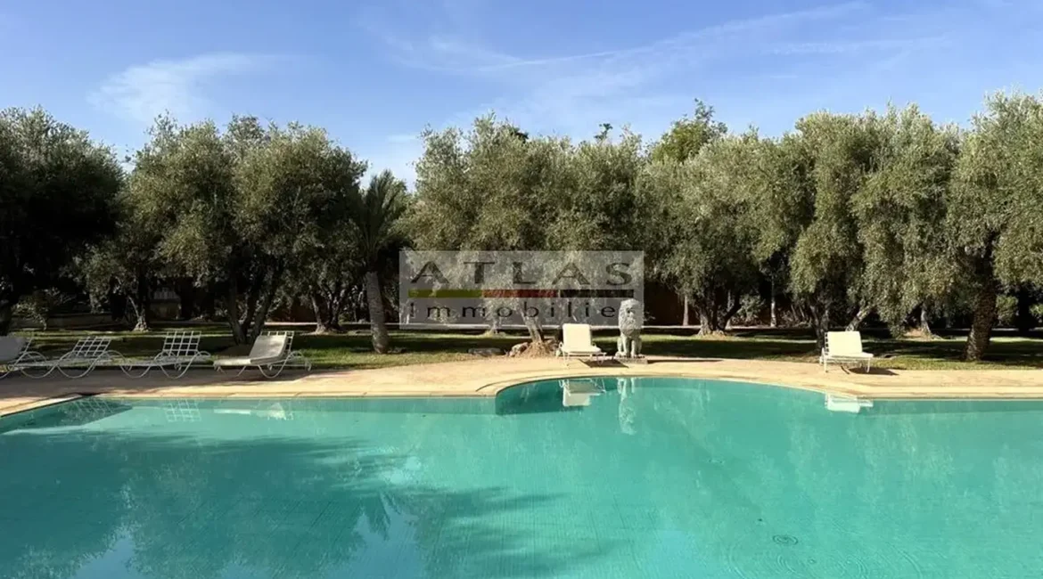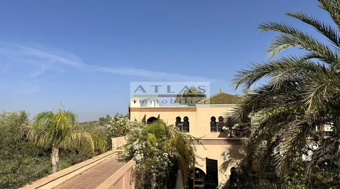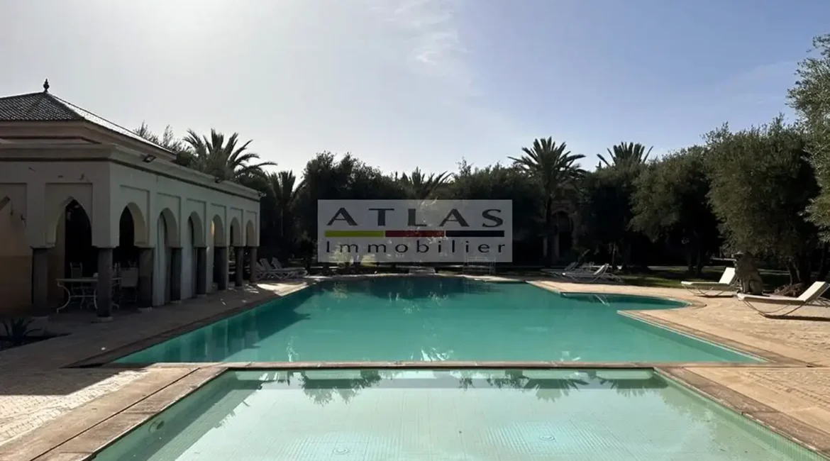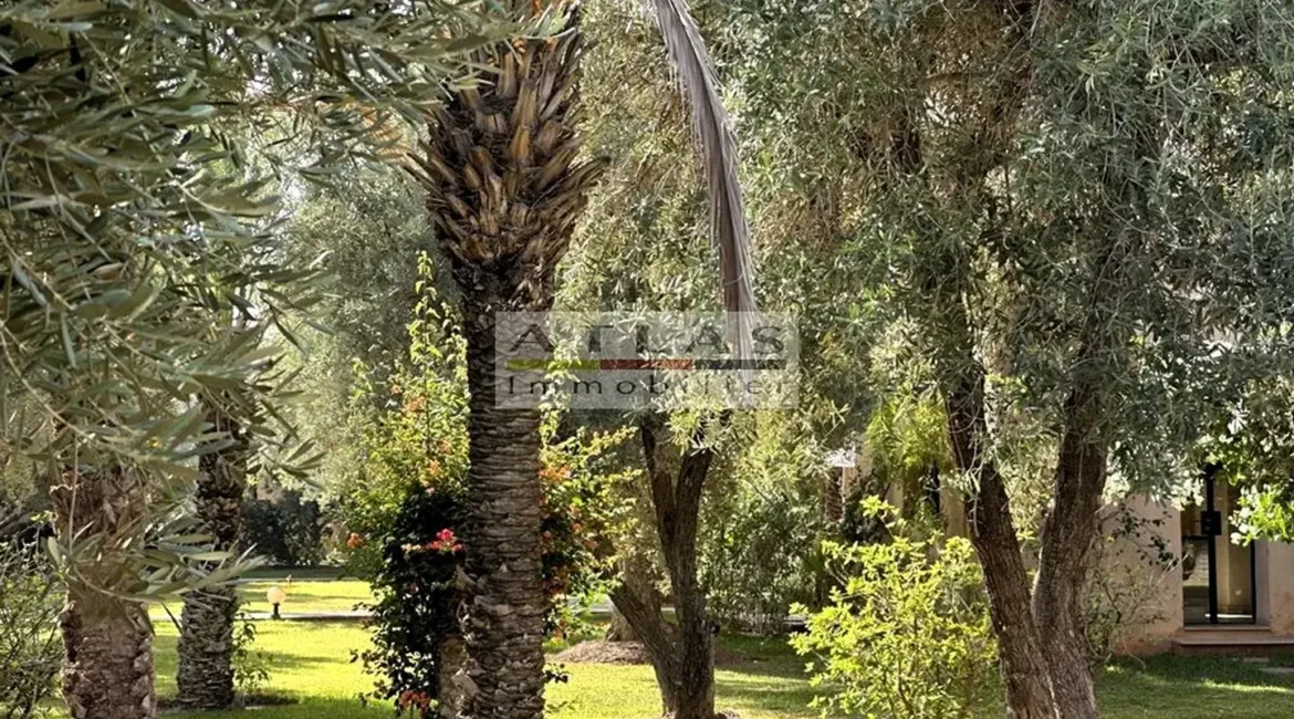 À seulement dix kilomètres du centre de Marrakech, cette magnifique villa est nichée au cœur d’un domaine privé, dans un environnement calme et parfaitement entretenu. Son architecture, inspirée de l’esprit des riads traditionnels, s’articule autour d’un vaste patio central de 65 m², offrant une atmosphère unique, lumineuse et conviviale. Entourée d’un parc paysager planté d’oliviers et agrémentée d’une grande piscine, elle propose un cadre de vie enchanteur, idéal pour savourer la douceur de la campagne tout en restant à proximité immédiate de la ville ocre.