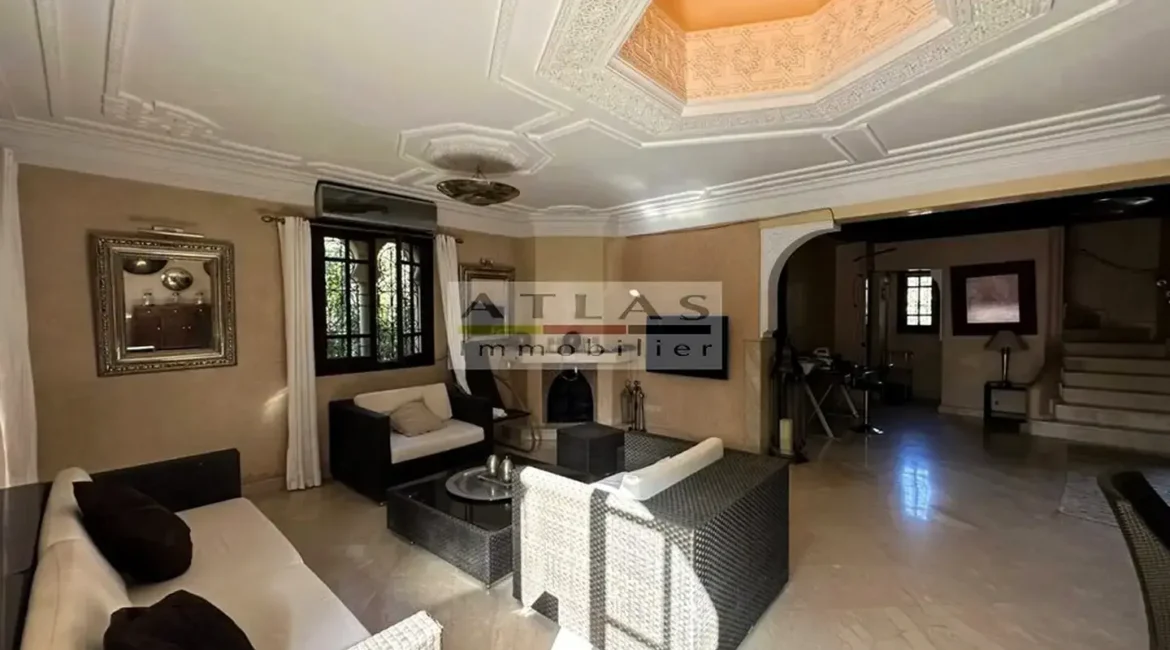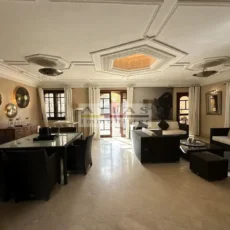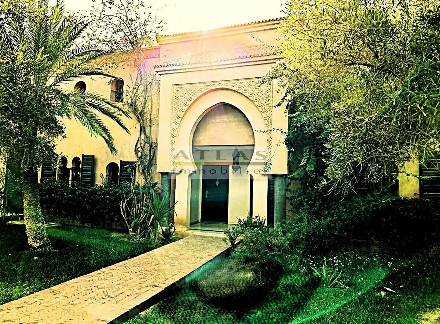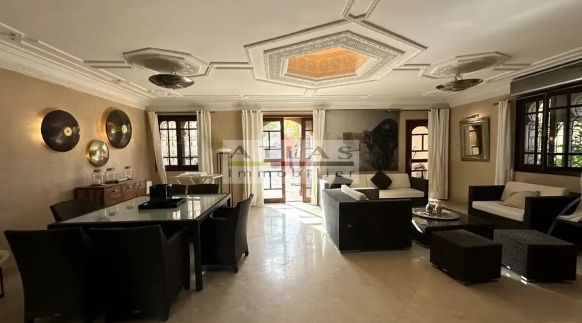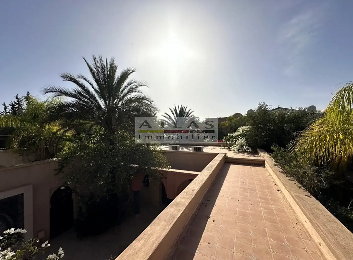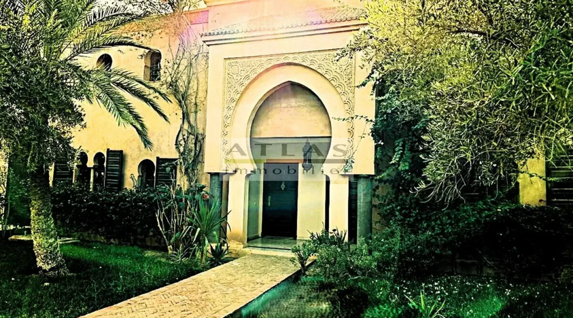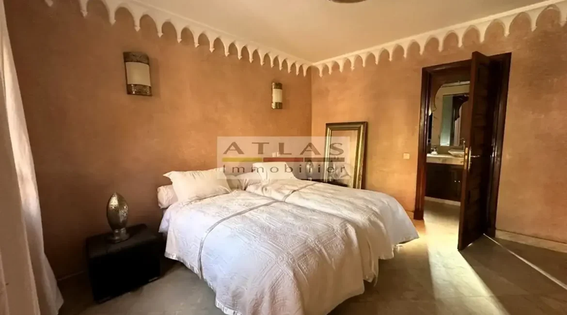 À seulement dix kilomètres du centre de Marrakech, cette magnifique villa est nichée au cœur d’un domaine privé, dans un environnement calme et parfaitement entretenu. Son architecture, inspirée de l’esprit des riads traditionnels, s’articule autour d’un vaste patio central de 65 m², offrant une atmosphère unique, lumineuse et conviviale. Entourée d’un parc paysager planté d’oliviers et agrémentée d’une grande piscine, elle propose un cadre de vie enchanteur, idéal pour savourer la douceur de la campagne tout en restant à proximité immédiate de la ville ocre.
