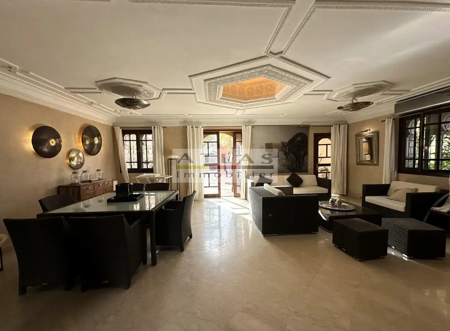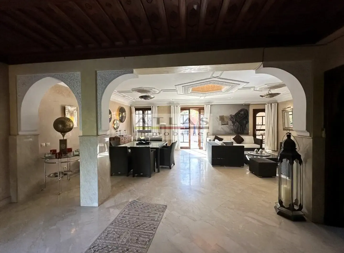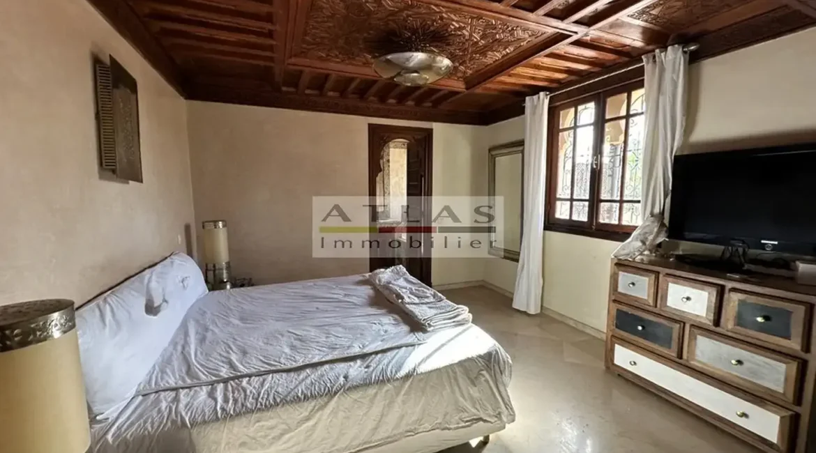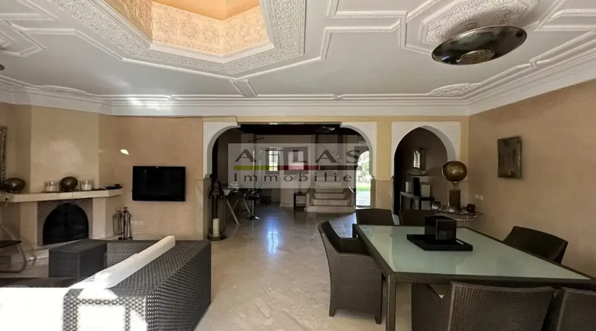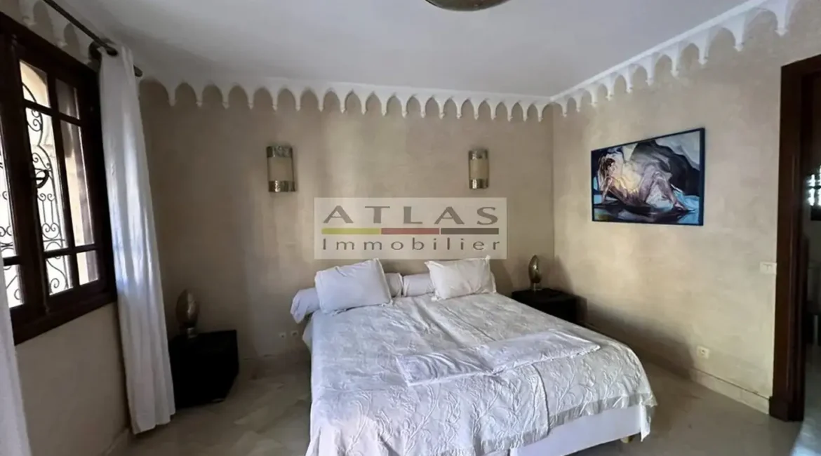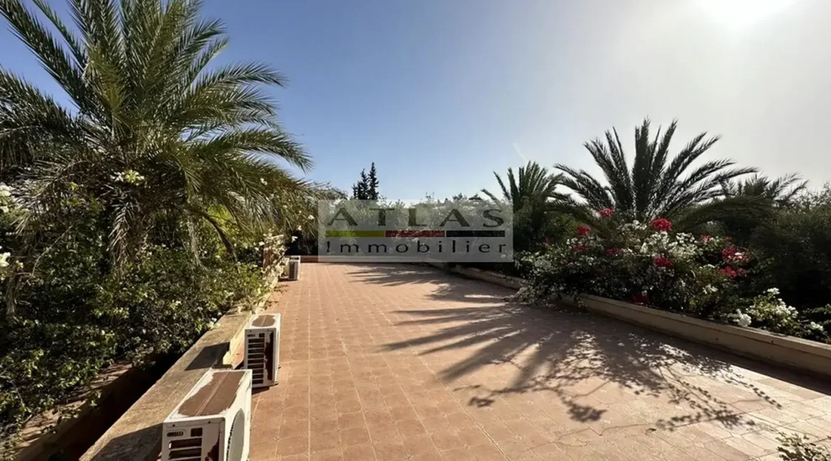 À seulement dix kilomètres du centre de Marrakech, cette magnifique villa est nichée au cœur d’un domaine privé, dans un environnement calme et parfaitement entretenu. Son architecture, inspirée de l’esprit des riads traditionnels, s’articule autour d’un vaste patio central de 65 m², offrant une atmosphère unique, lumineuse et conviviale. Entourée d’un parc paysager planté d’oliviers et agrémentée d’une grande piscine, elle propose un cadre de vie enchanteur, idéal pour savourer la douceur de la campagne tout en restant à proximité immédiate de la ville ocre.
