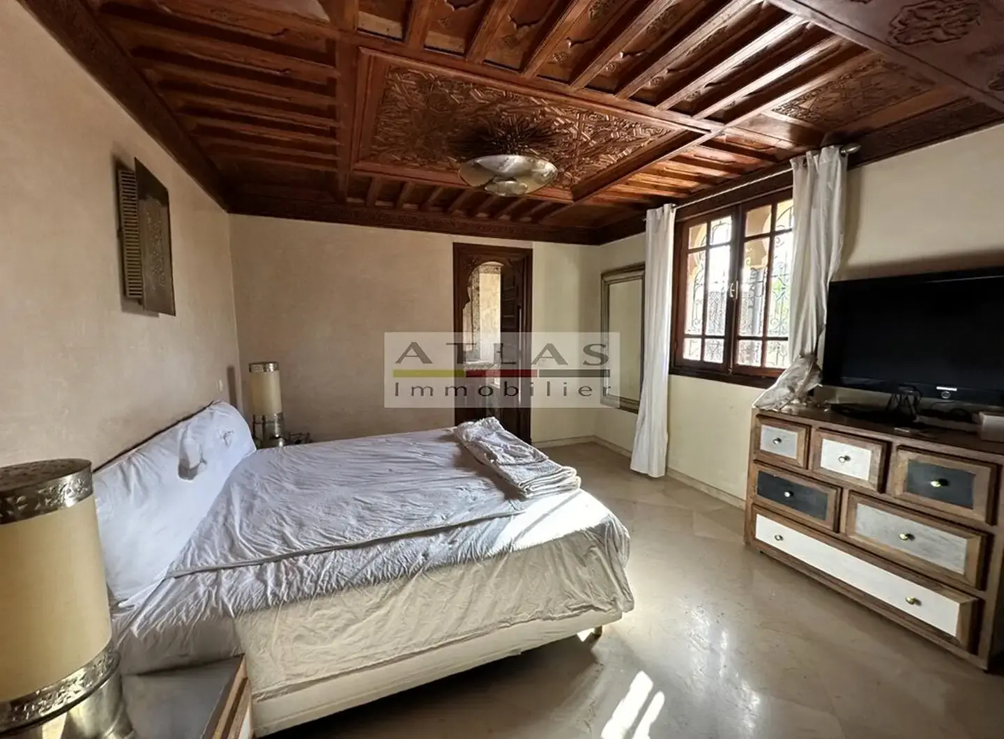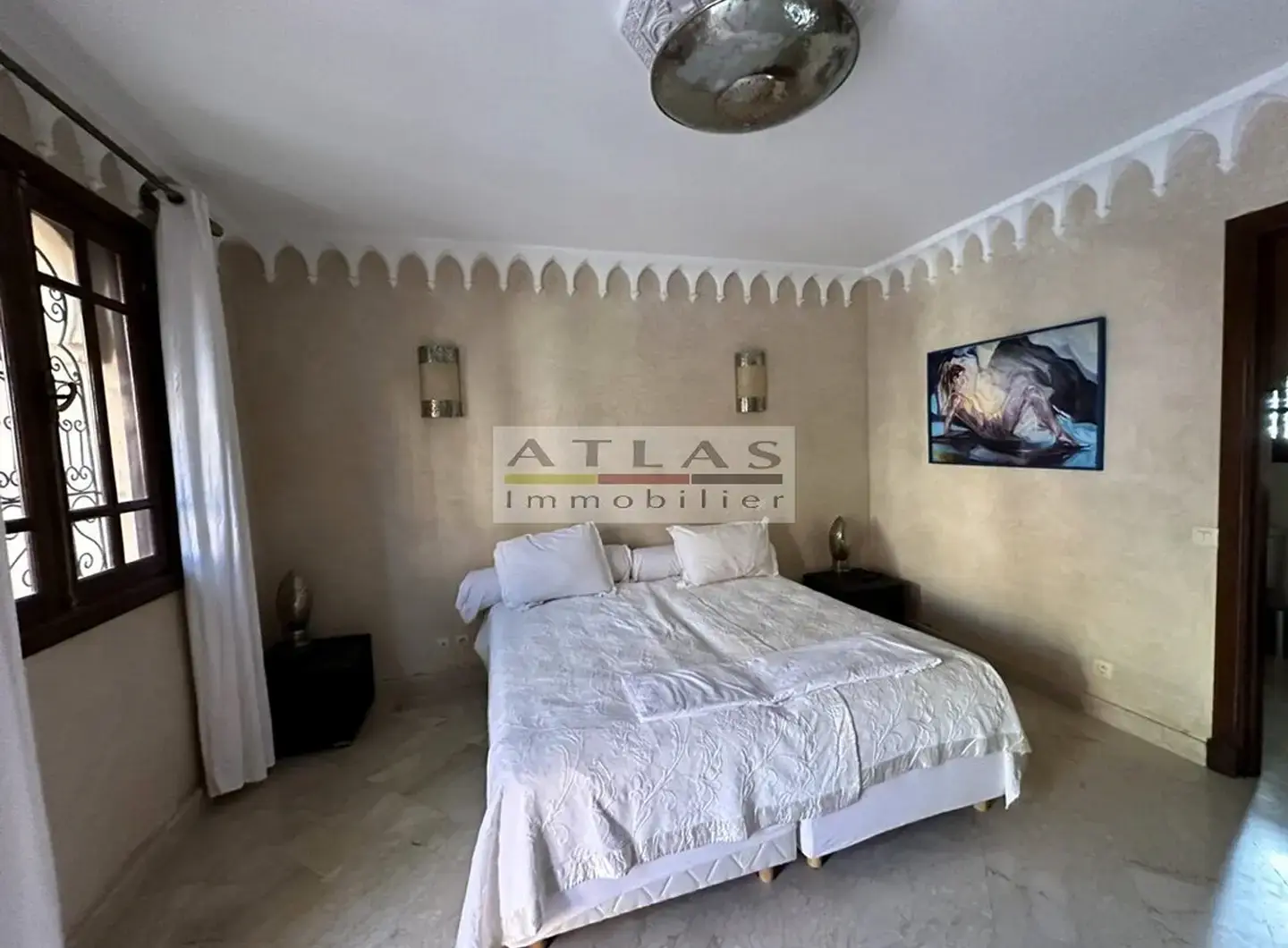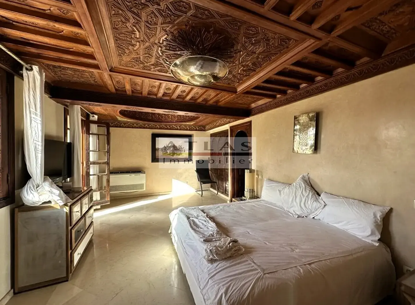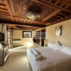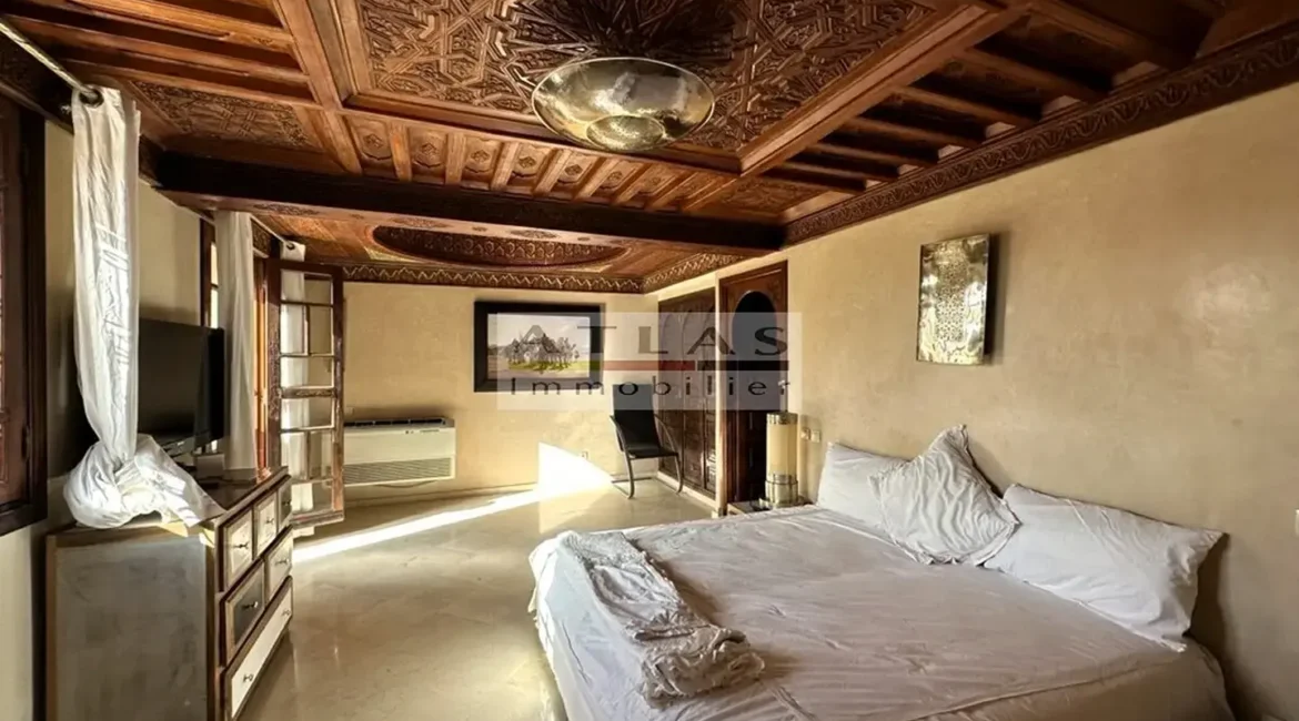À l’étage, une superbe suite climatisée avec salle de bains privative s’ouvre sur une grande terrasse panoramique de 110 m², dotée d’un coin repas pour profiter des soirées marocaines dans un cadre exceptionnel.