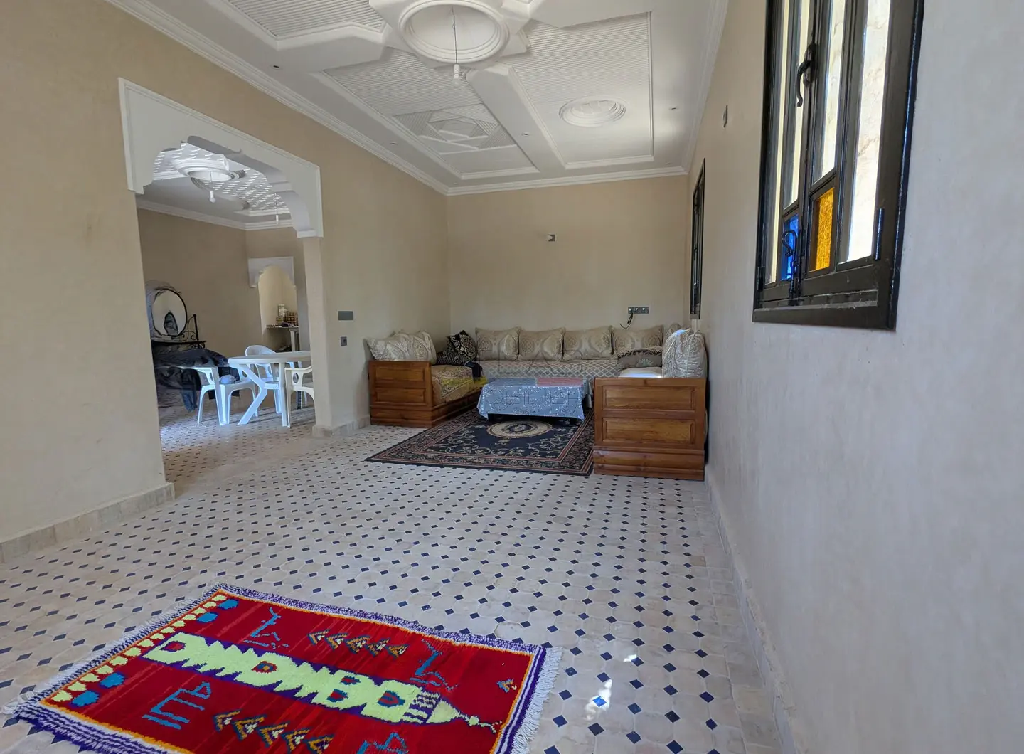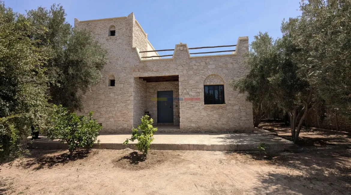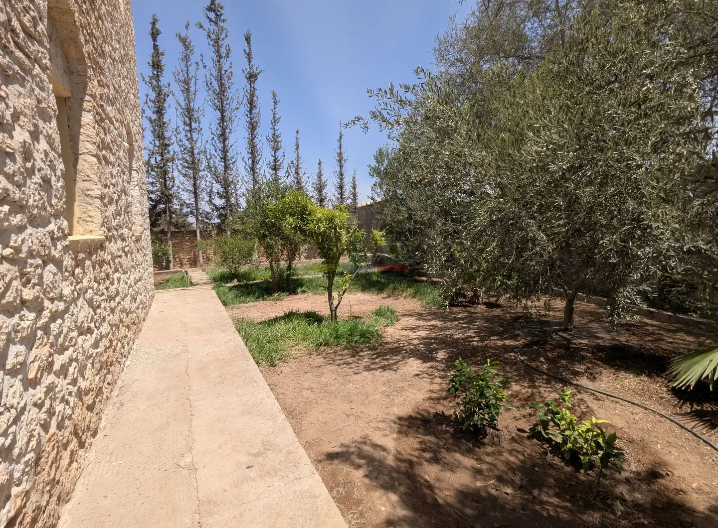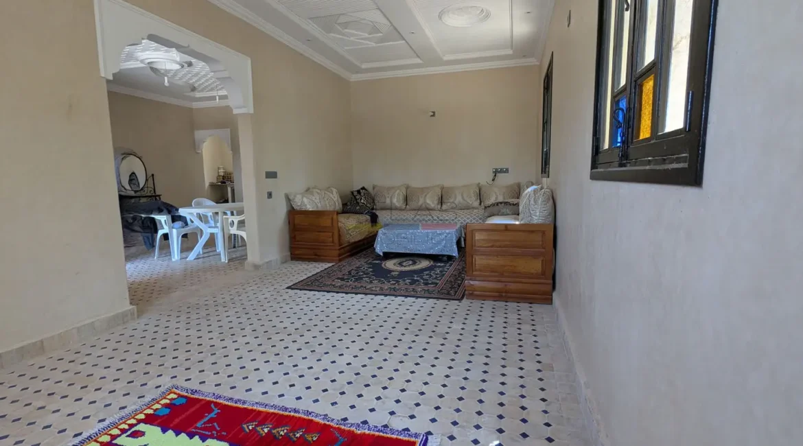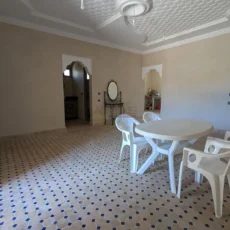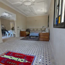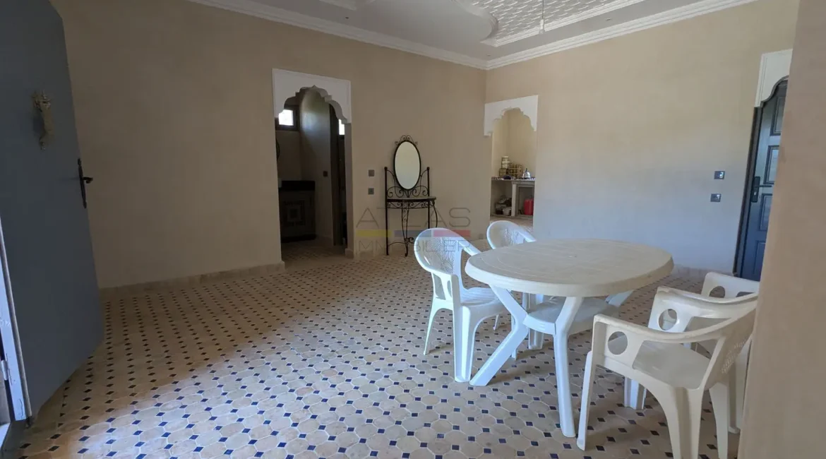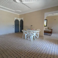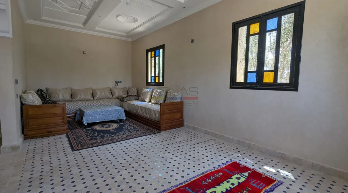 Dès l’entrée, un grand hall distribue un vaste salon convivial, une cuisine fonctionnelle et parfaitement aménagée, ainsi qu’une grande terrasse ouverte sur un superbe jardin arboré d’oliviers, de figuiers, de citronniers et de grenadiers. Cet extérieur verdoyant offre une atmosphère sereine et authentique, idéale pour profiter du climat doux de la région d’Essaouira.