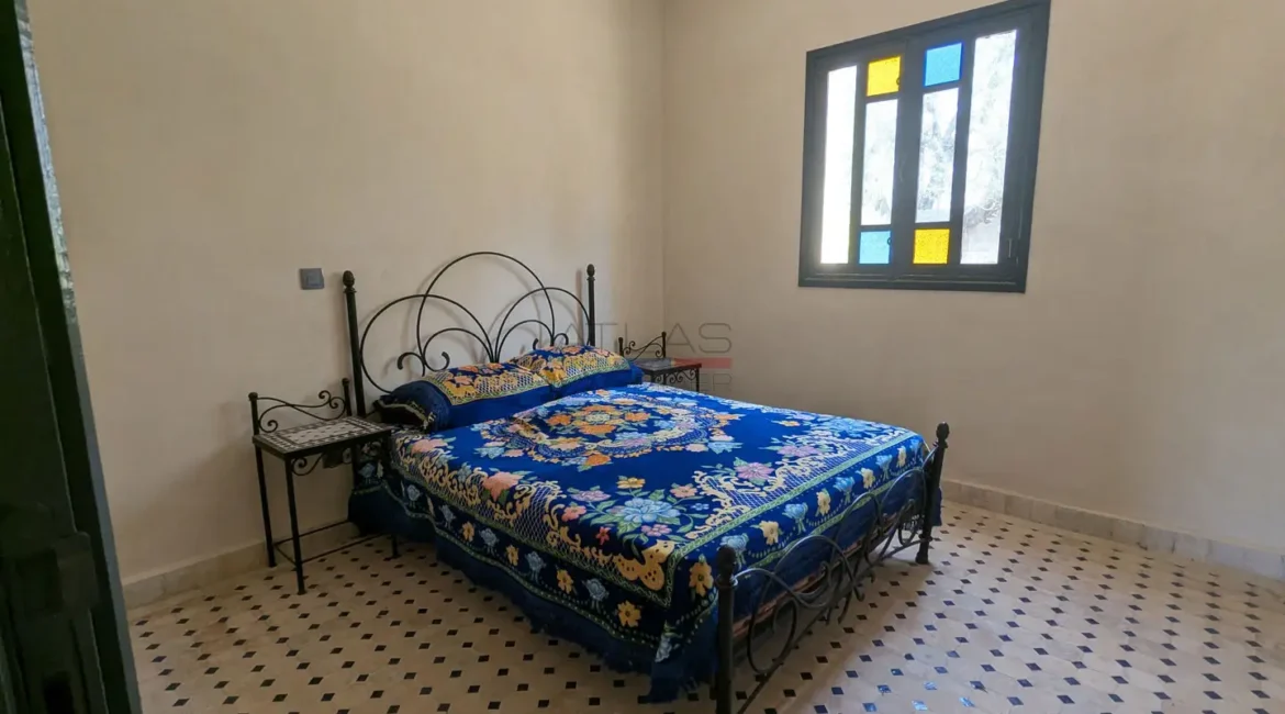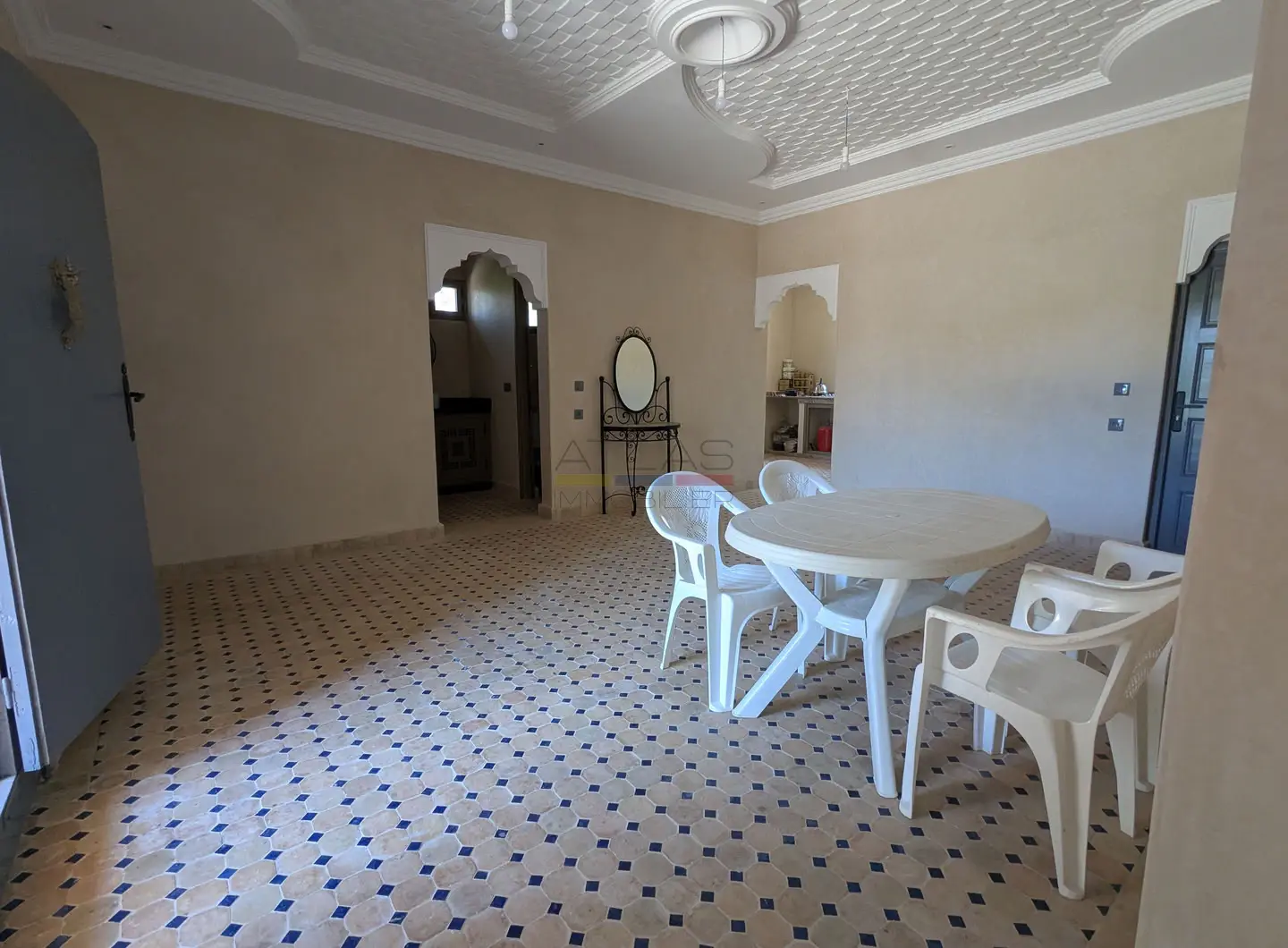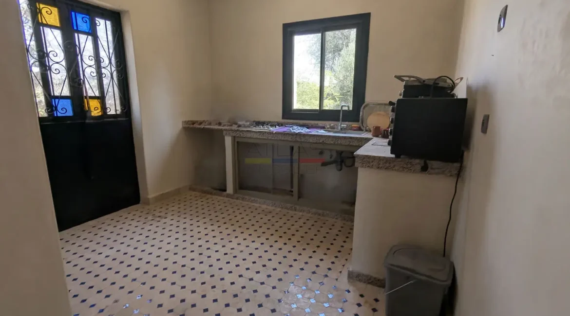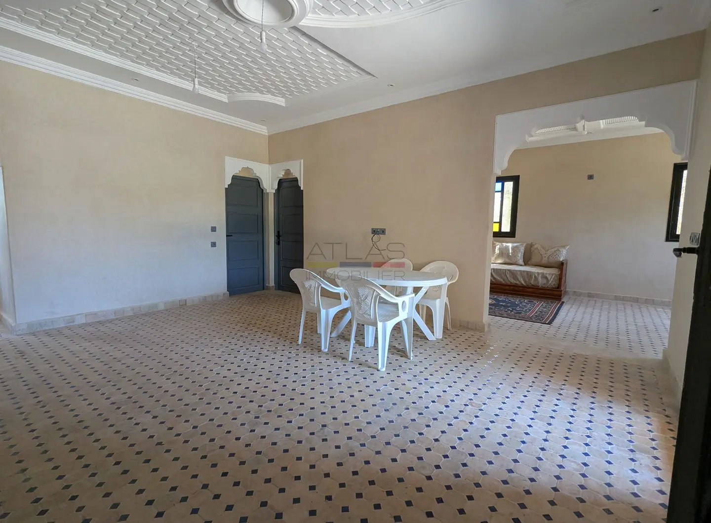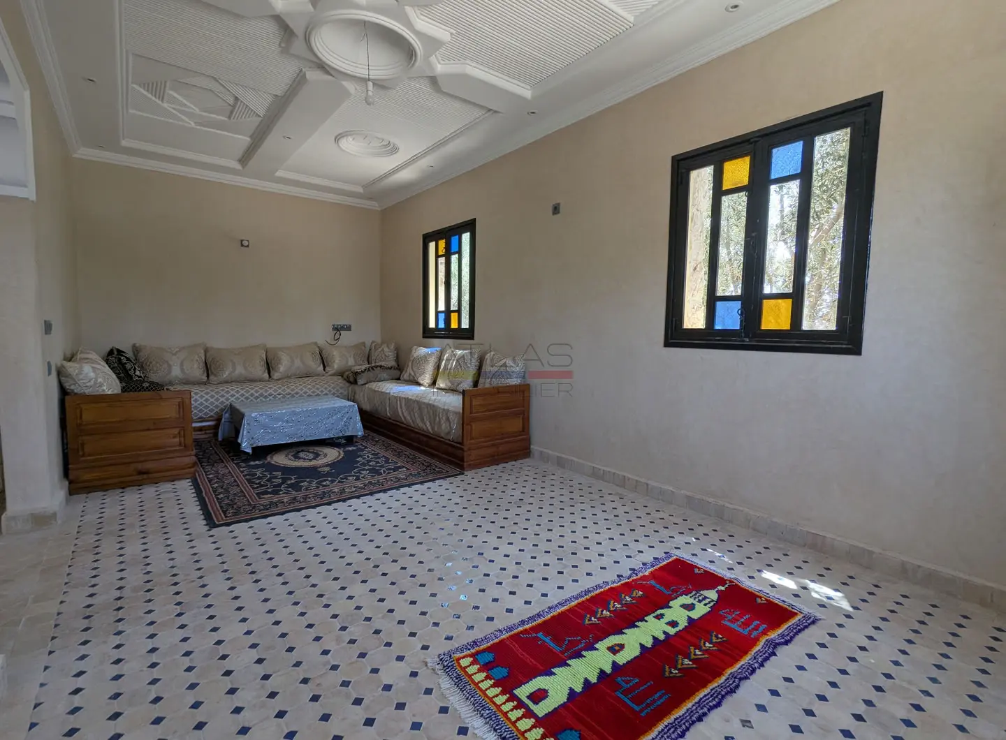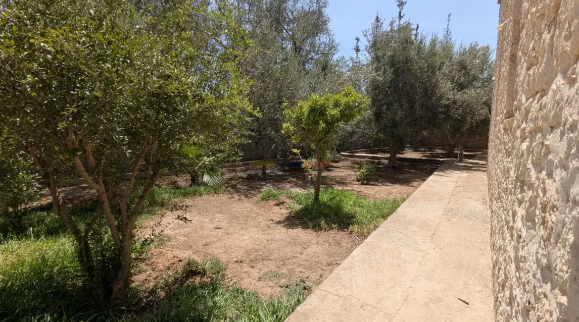 Dès l’entrée, un grand hall distribue un vaste salon convivial, une cuisine fonctionnelle et parfaitement aménagée, ainsi qu’une grande terrasse ouverte sur un superbe jardin arboré d’oliviers, de figuiers, de citronniers et de grenadiers. Cet extérieur verdoyant offre une atmosphère sereine et authentique, idéale pour profiter du climat doux de la région d’Essaouira.