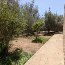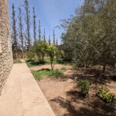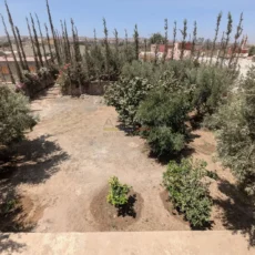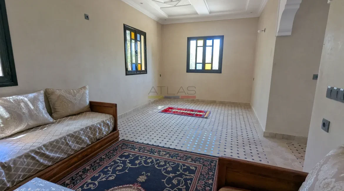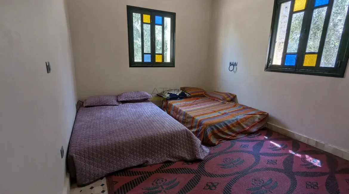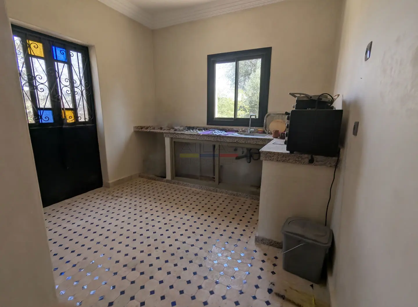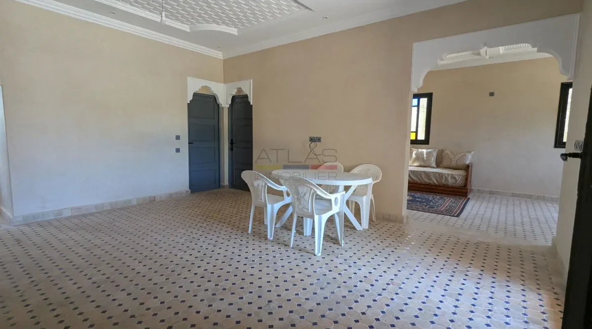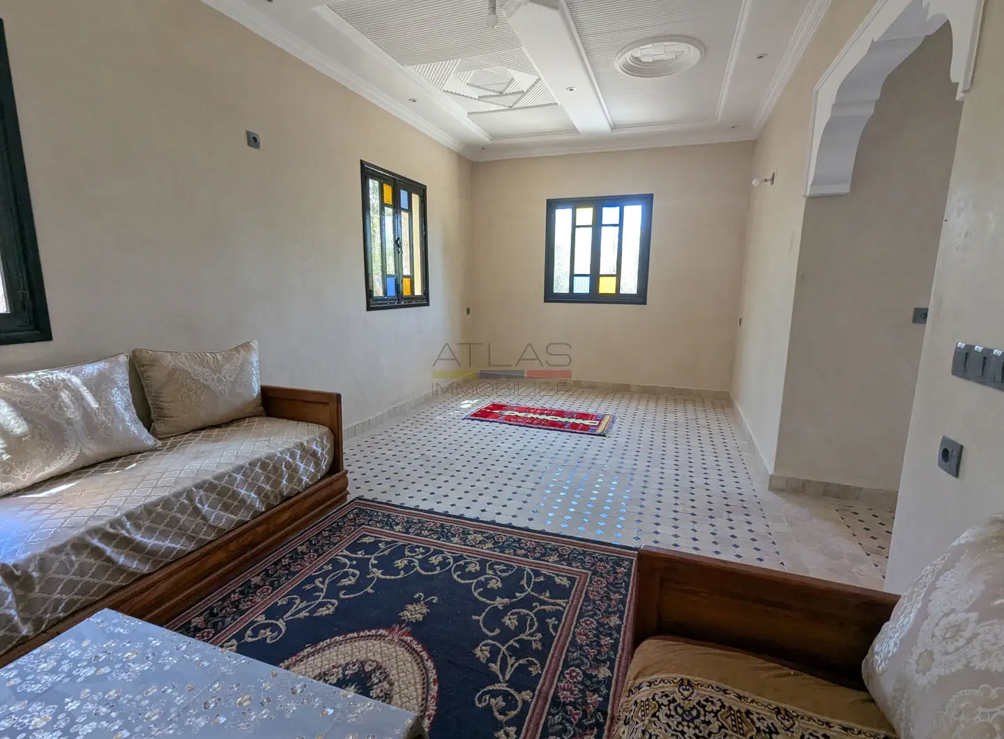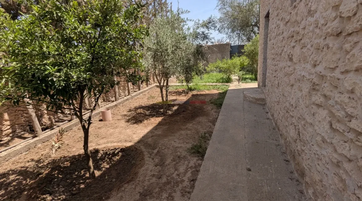 Dès l’entrée, un grand hall distribue un vaste salon convivial, une cuisine fonctionnelle et parfaitement aménagée, ainsi qu’une grande terrasse ouverte sur un superbe jardin arboré d’oliviers, de figuiers, de citronniers et de grenadiers. Cet extérieur verdoyant offre une atmosphère sereine et authentique, idéale pour profiter du climat doux de la région d’Essaouira.