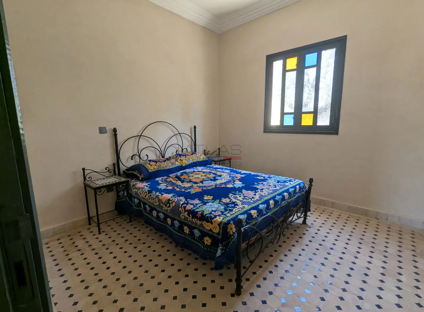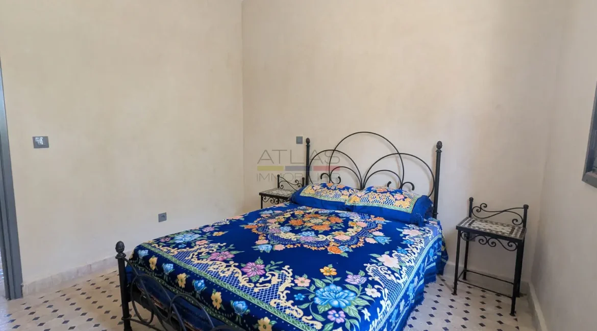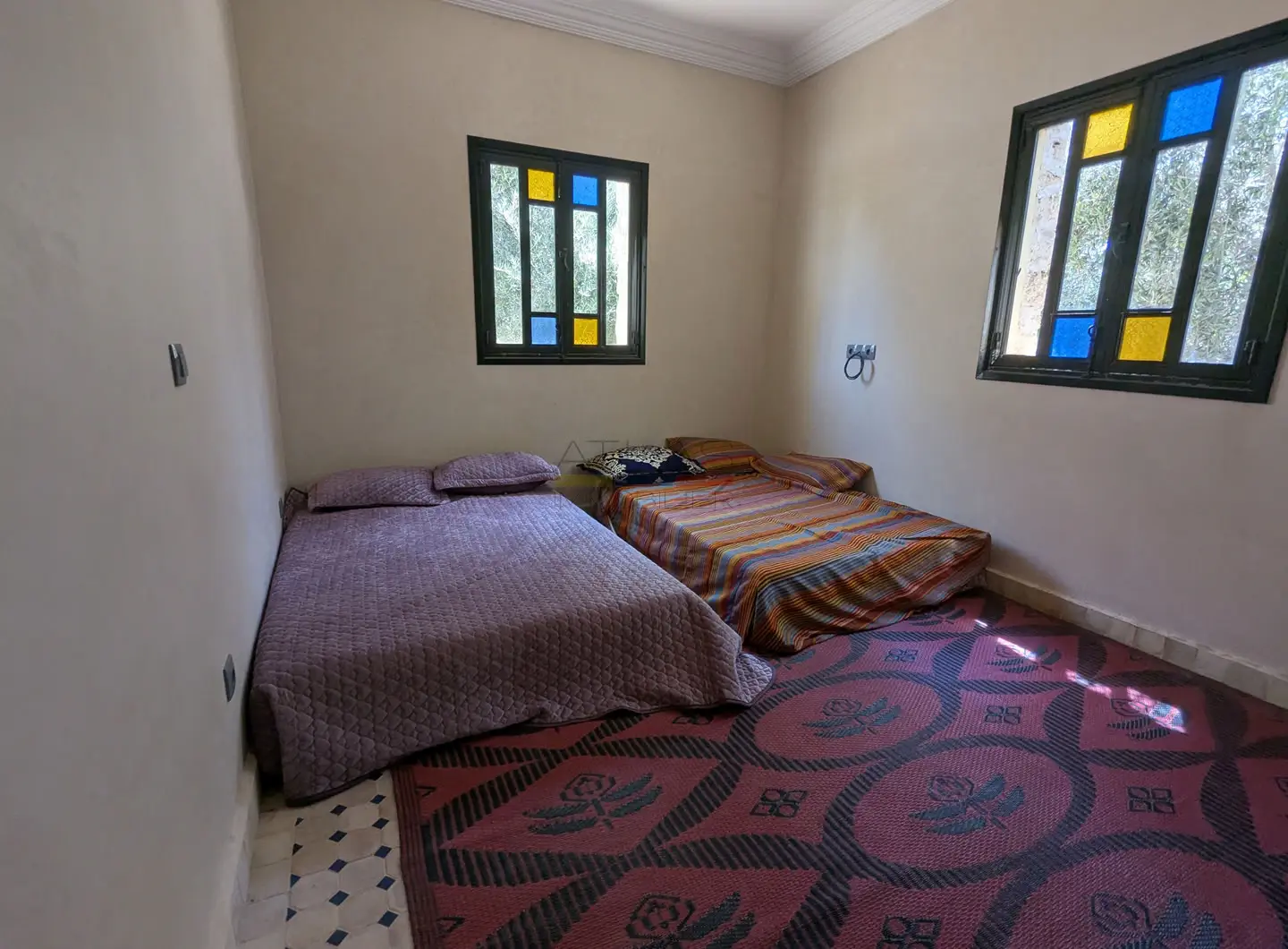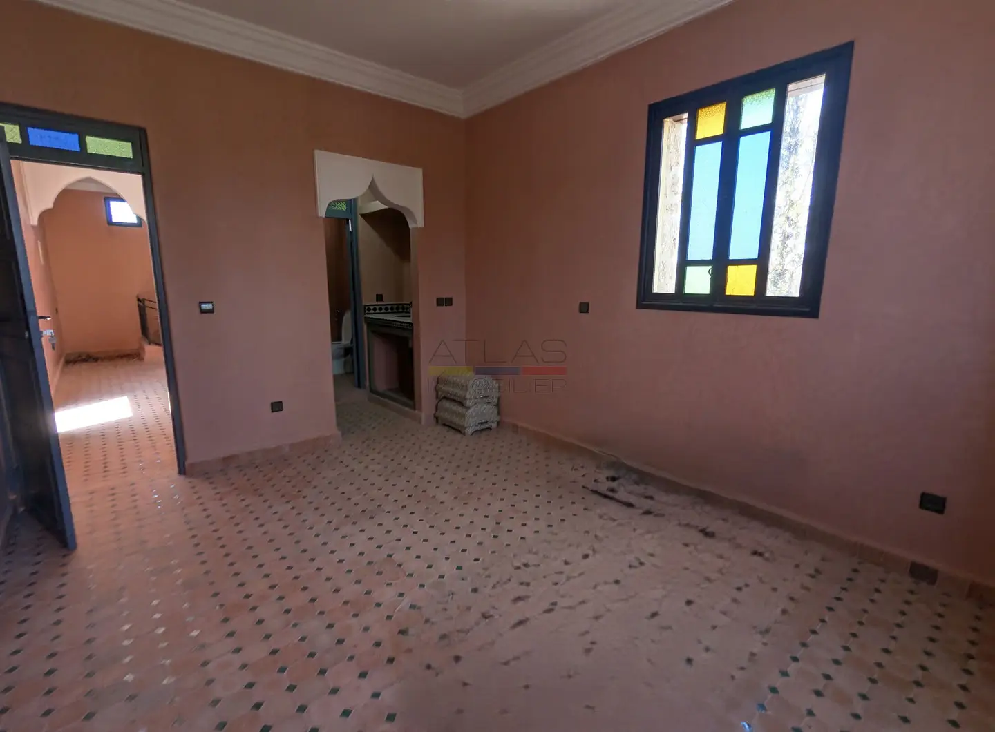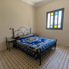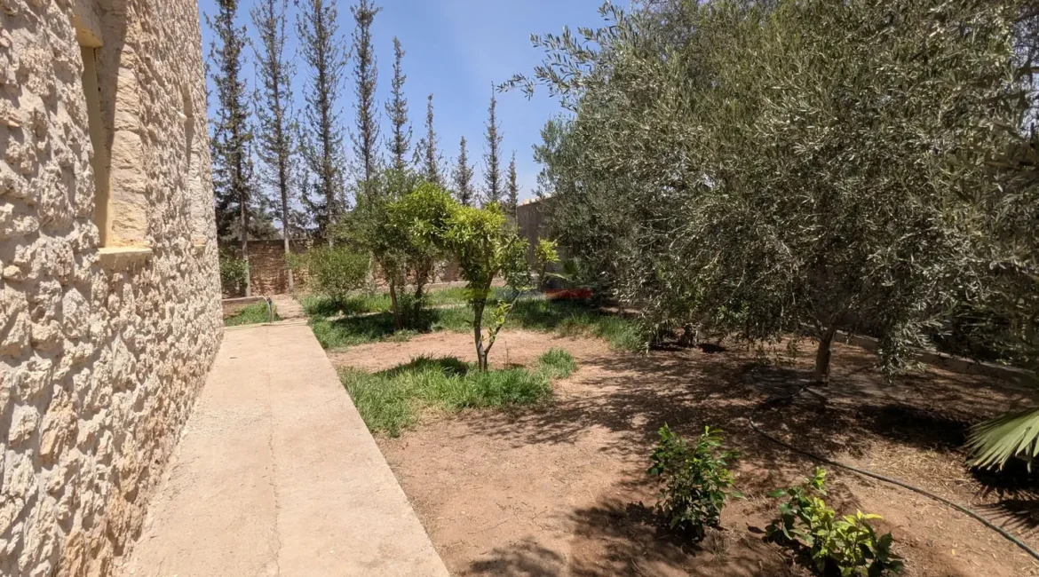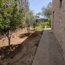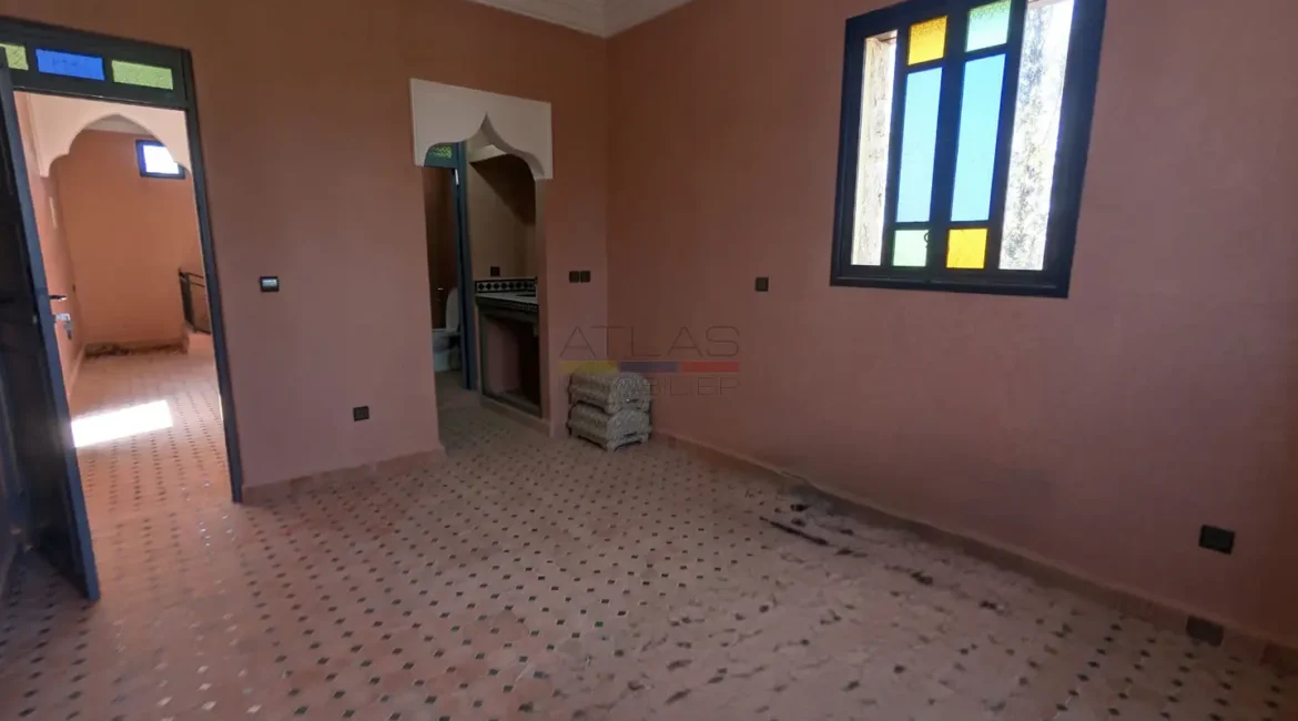 Dès l’entrée, un grand hall distribue un vaste salon convivial, une cuisine fonctionnelle et parfaitement aménagée, ainsi qu’une grande terrasse ouverte sur un superbe jardin arboré d’oliviers, de figuiers, de citronniers et de grenadiers. Cet extérieur verdoyant offre une atmosphère sereine et authentique, idéale pour profiter du climat doux de la région d’Essaouira.