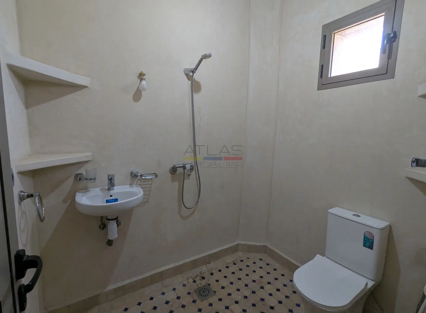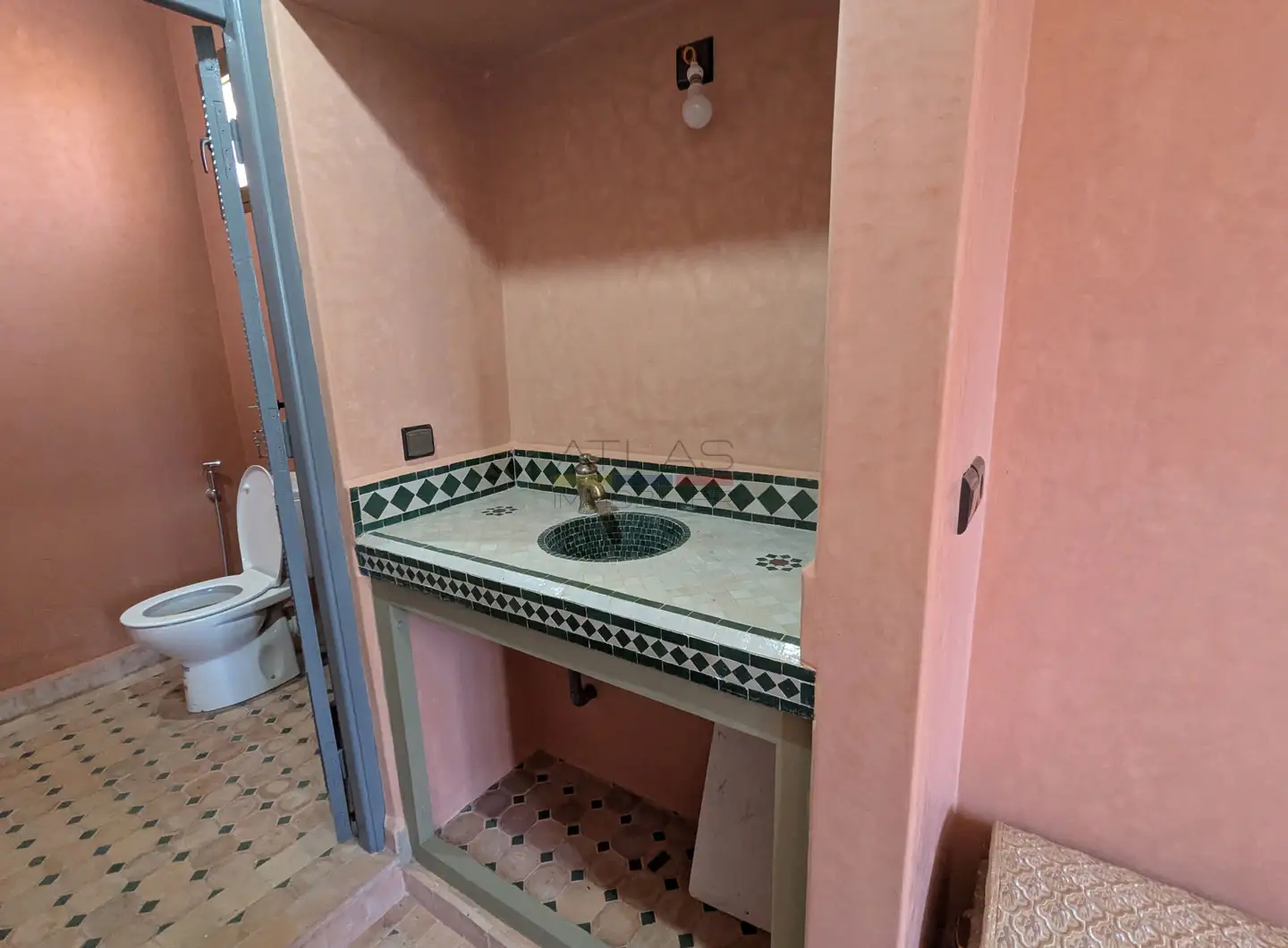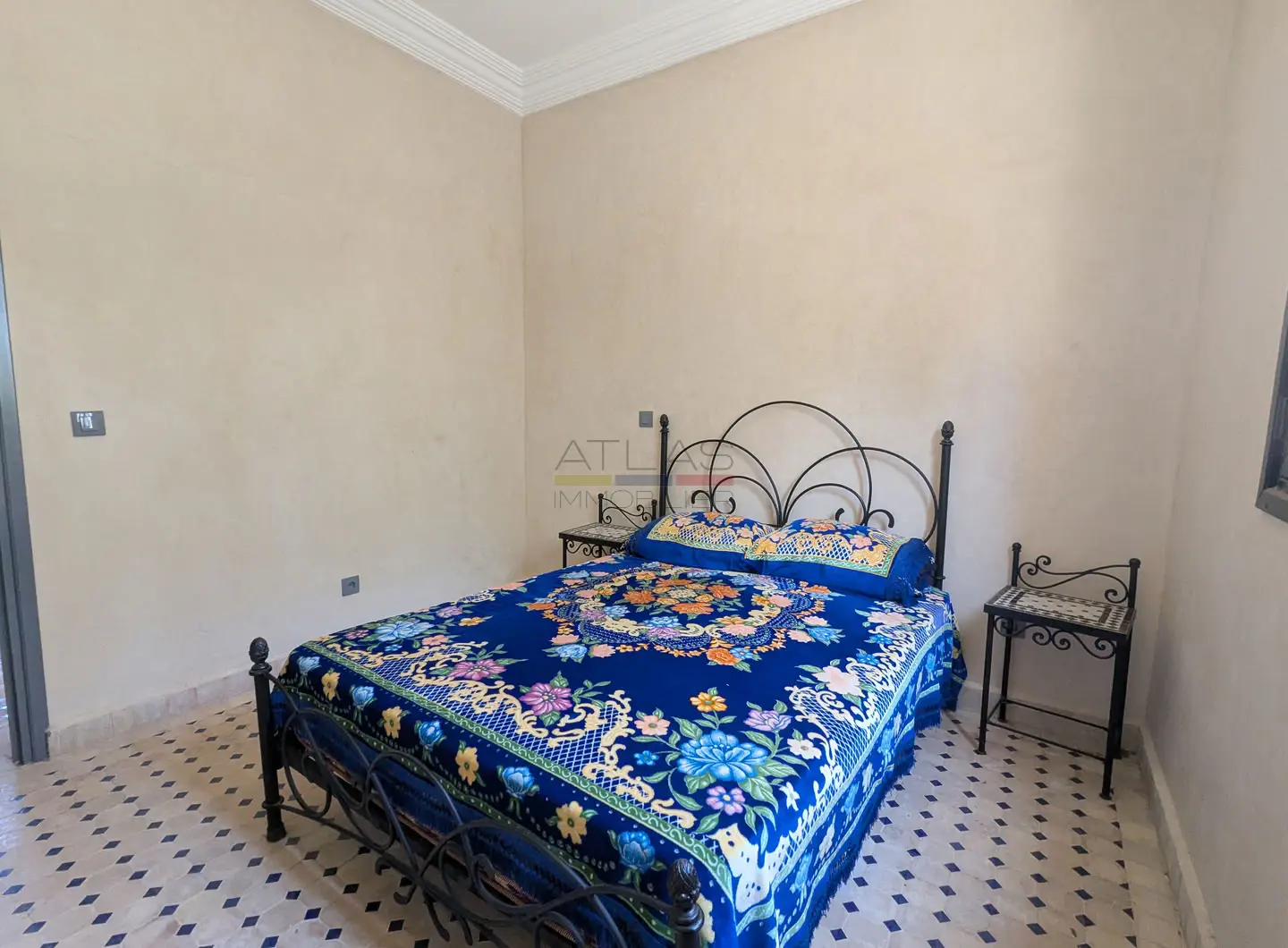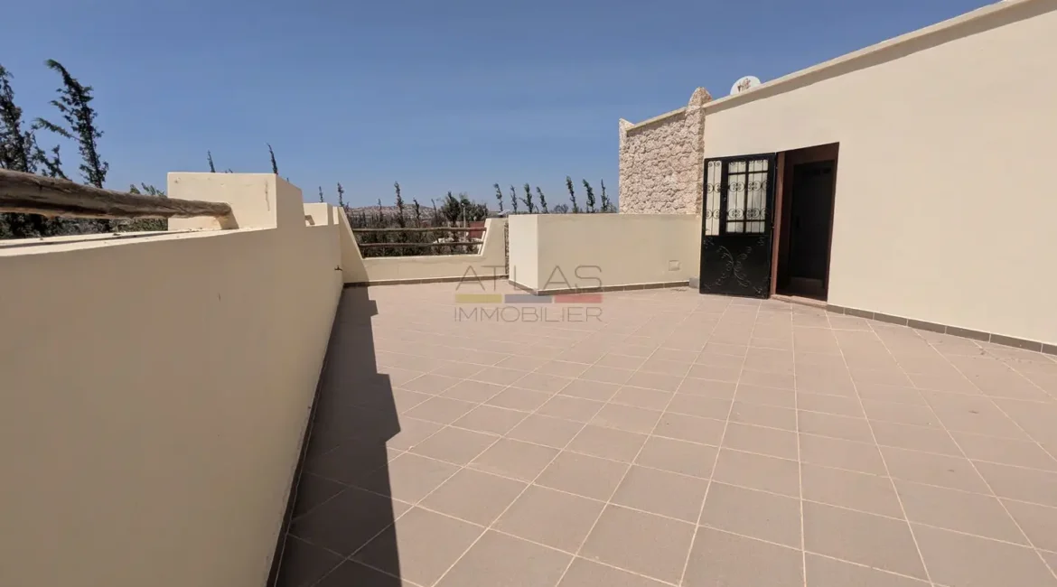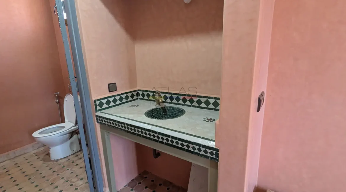 Dès l’entrée, un grand hall distribue un vaste salon convivial, une cuisine fonctionnelle et parfaitement aménagée, ainsi qu’une grande terrasse ouverte sur un superbe jardin arboré d’oliviers, de figuiers, de citronniers et de grenadiers. Cet extérieur verdoyant offre une atmosphère sereine et authentique, idéale pour profiter du climat doux de la région d’Essaouira.