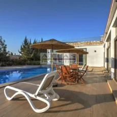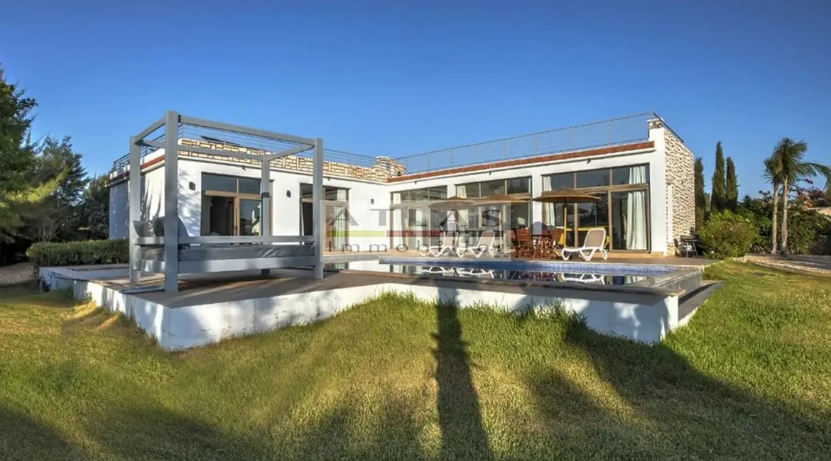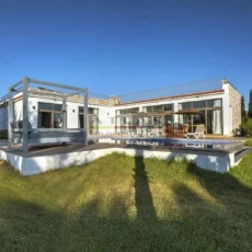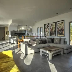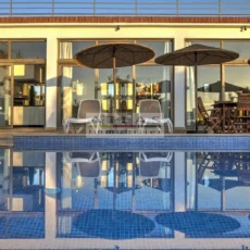Les espaces extérieurs, soigneusement aménagés, comprennent une grande piscine, des terrasses et des salons extérieurs, parfaits pour des repas en plein air et des moments de détente. Depuis la terrasse supérieure, le panorama s’ouvre sur l’océan, offrant chaque jour le spectacle du lever et du coucher du soleil.