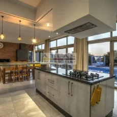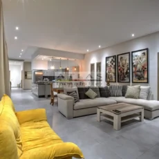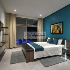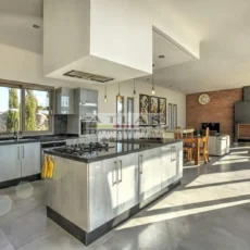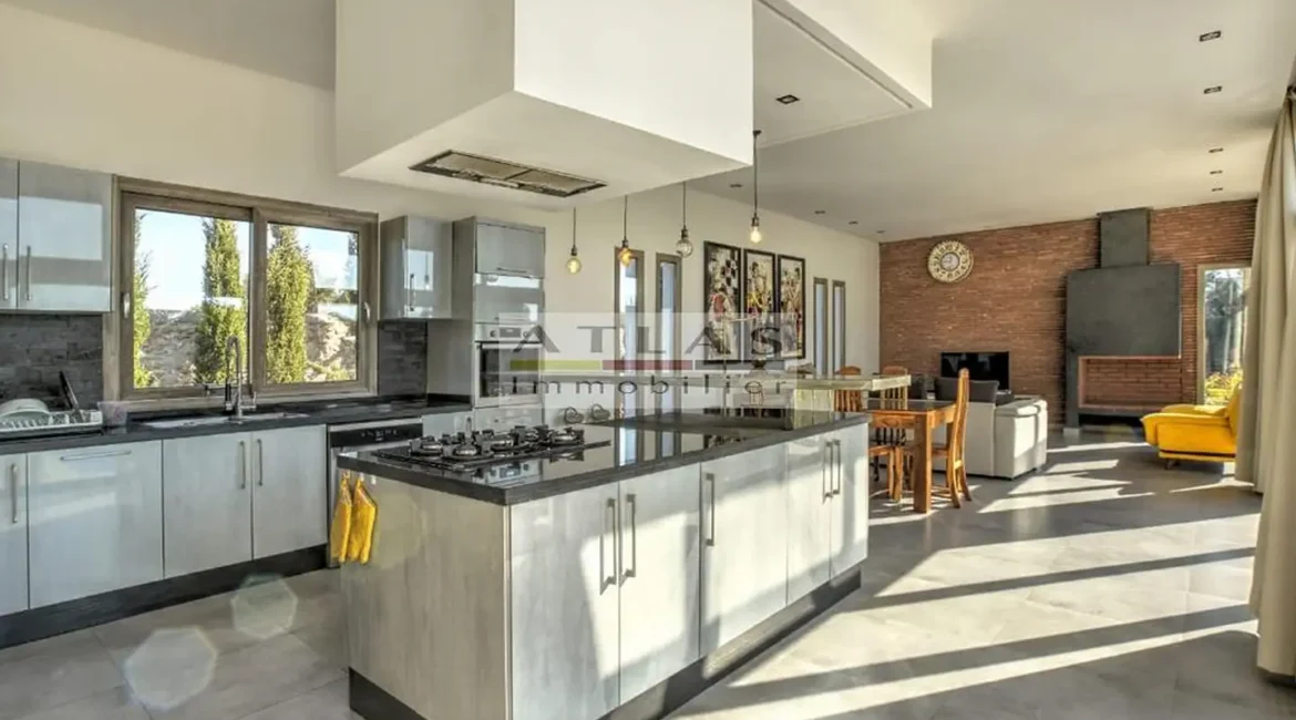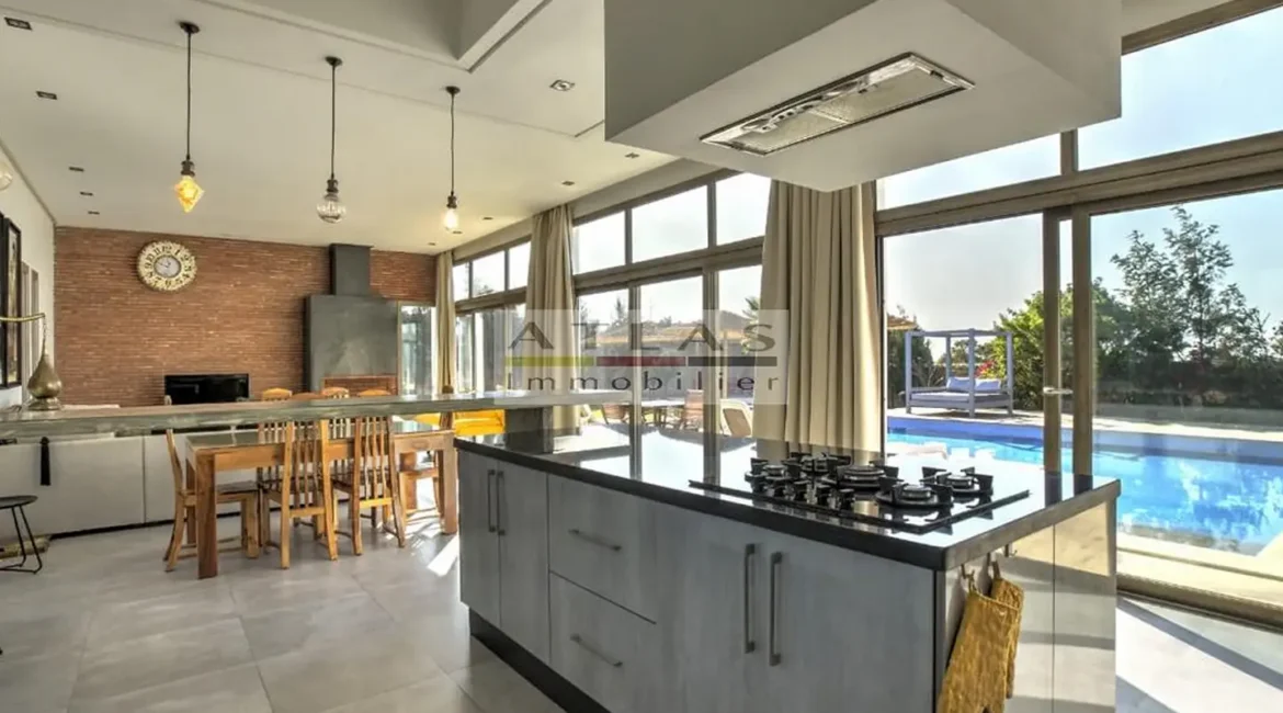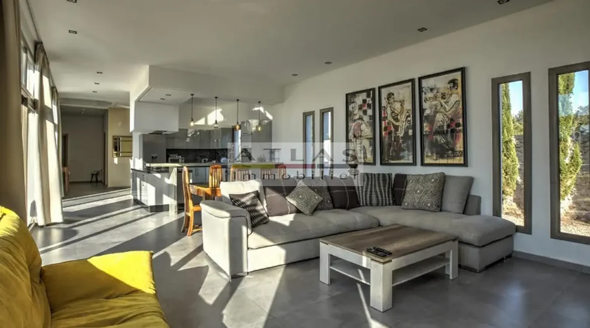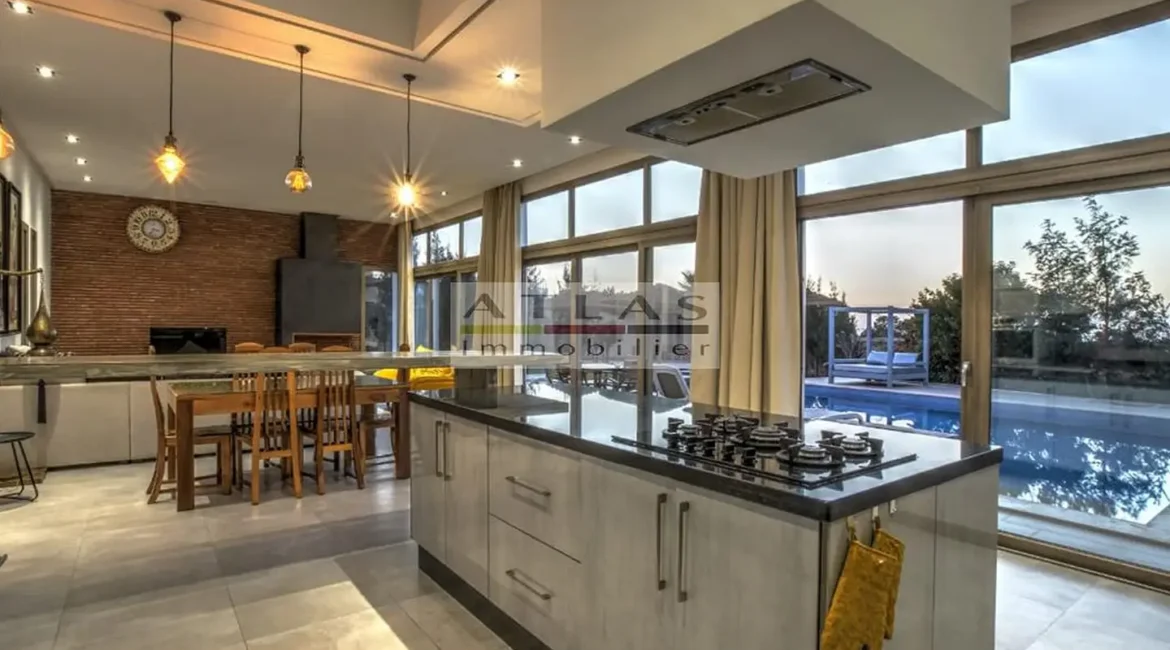 La villa dispose de quatre chambres spacieuses, chacune avec sa salle de bain privative, dont une suite parentale pensée pour offrir intimité et confort. Sa cuisine américaine, entièrement équipée, s’ouvre sur un vaste salon inondé de lumière grâce à ses larges baies vitrées tournées vers l’extérieur.
