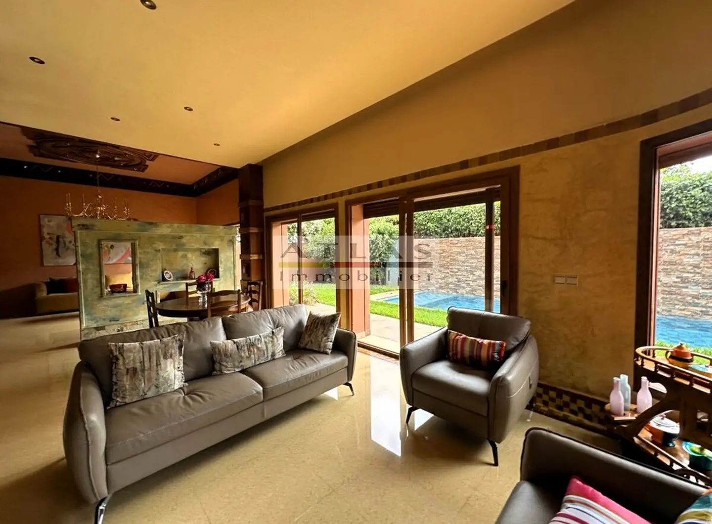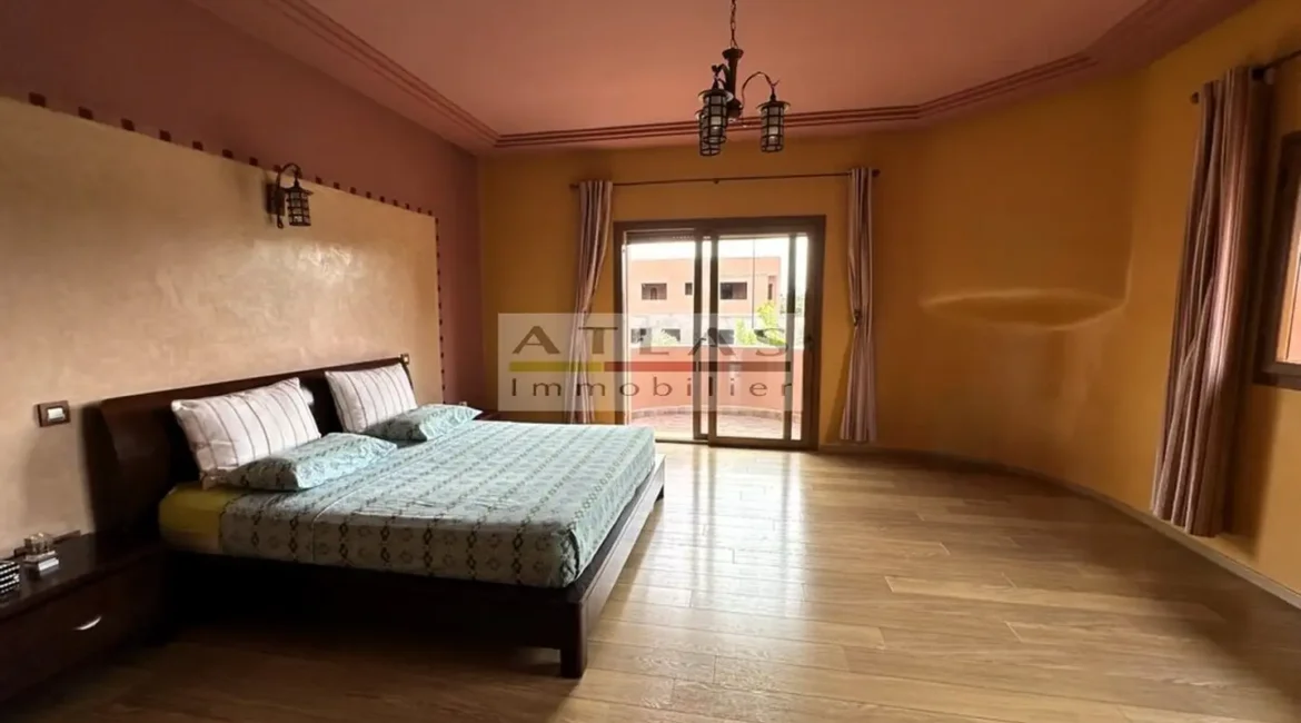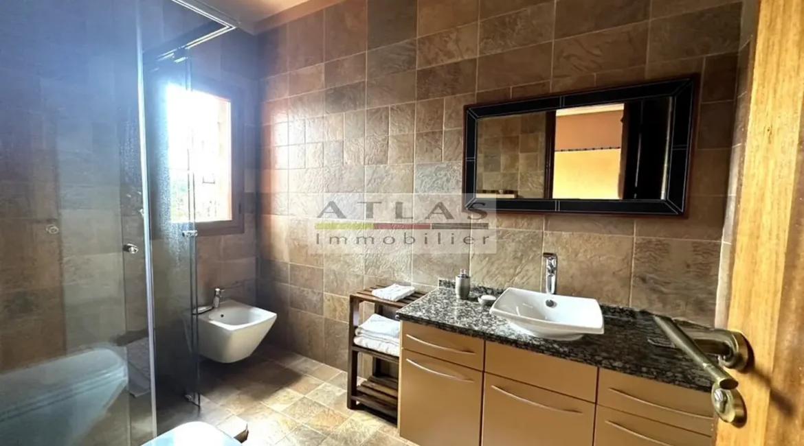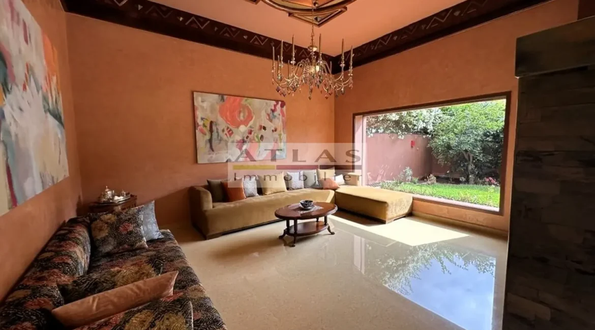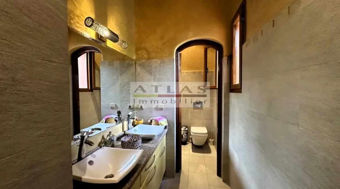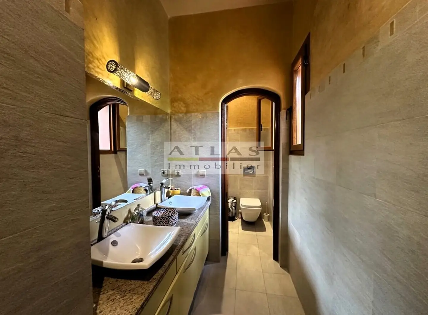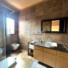 Située dans un quartier recherché à la sortie de Marrakech, cette magnifique villa contemporaine offre un cadre de vie exceptionnel, alliant confort, modernité et élégance. Le rez-de-chaussée vous accueille avec une vaste pièce à vivre en trois parties, baignée de lumière naturelle, et offrant une vue imprenable sur le jardin paysagé ainsi que sur la piscine privée. La grande cuisine entièrement aménagée et équipée vous permettra de préparer vos repas en toute convivialité, tandis que des toilettes pour invités ajoutent au confort. À l’étage, deux suites spacieuses, chacune avec sa salle de bain privative, ainsi que deux chambres supplémentaires partageant une salle de bain, offrent un espace de vie parfait pour toute la famille. Le sous-sol, entièrement aménagé avec une cour anglaise, dispose d’un espace de vie supplémentaire comprenant une terrasse, une cuisine, une chambre d’appoint, une buanderie et un garage. À l’extérieur, vous pourrez profiter d’une superbe piscine privée, accompagnée d’une douche extérieure et d’un solarium, l’endroit idéal pour se détendre sous le soleil de Marrakech. Ne manquez pas cette opportunité unique de vivre dans un cadre paisible et élégant, à seulement quelques minutes du centre de Marrakech.