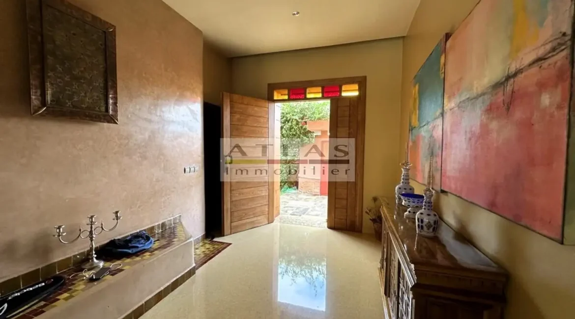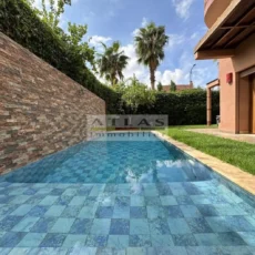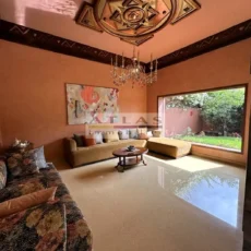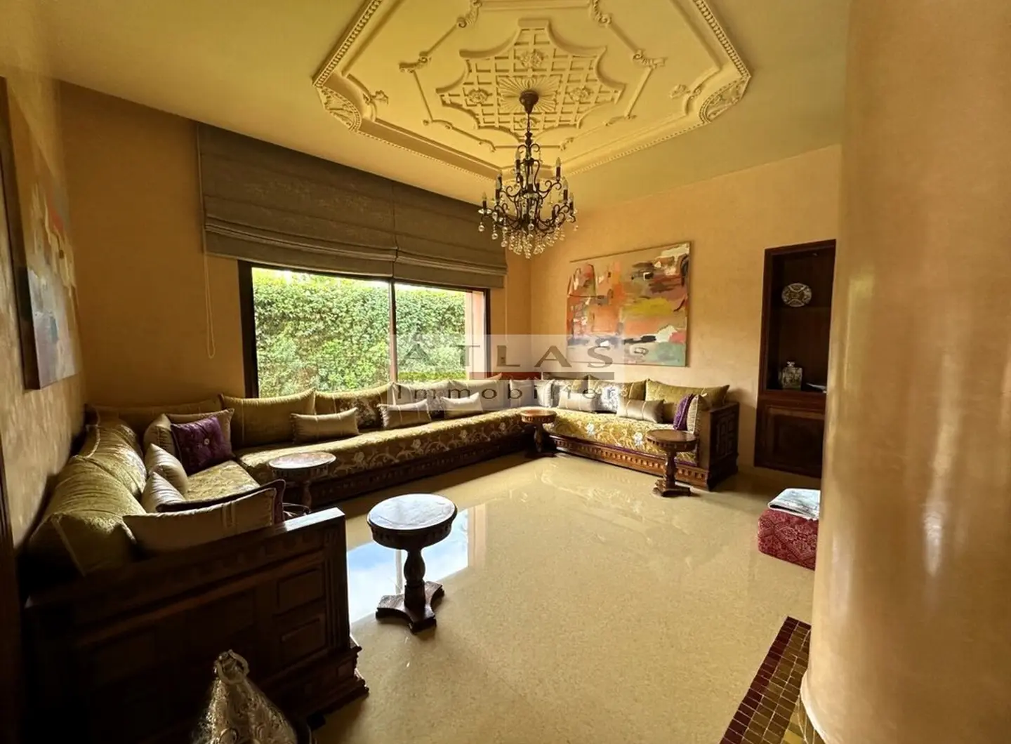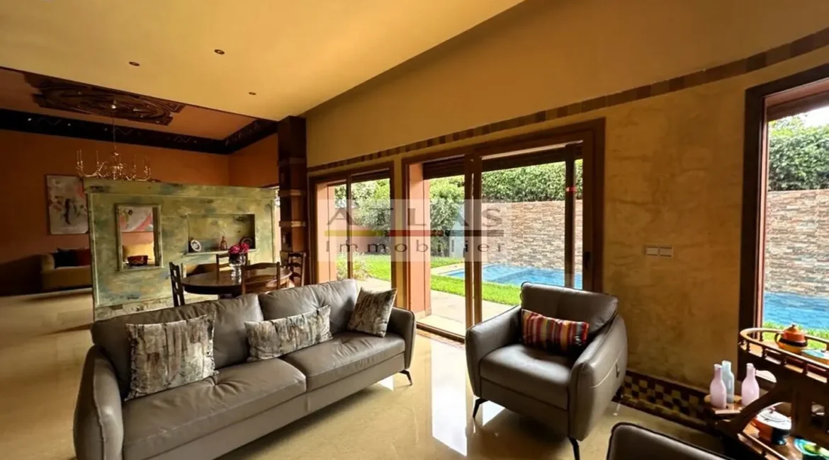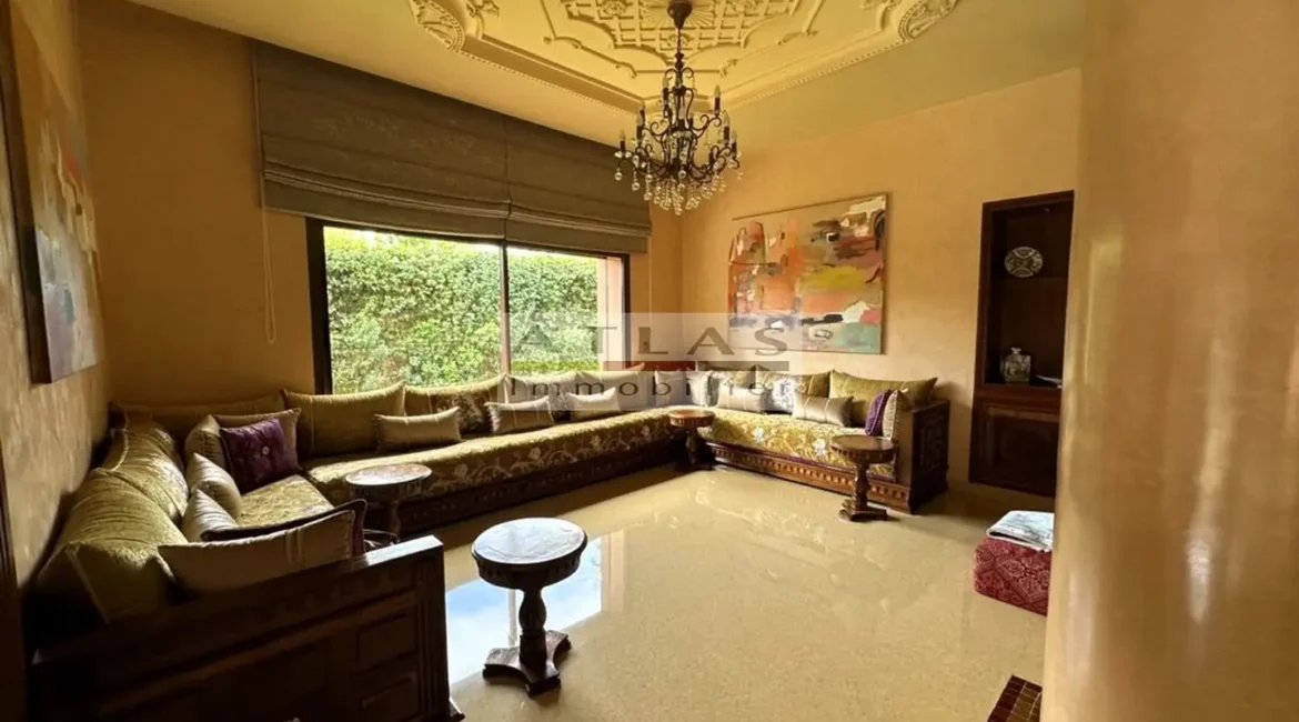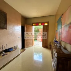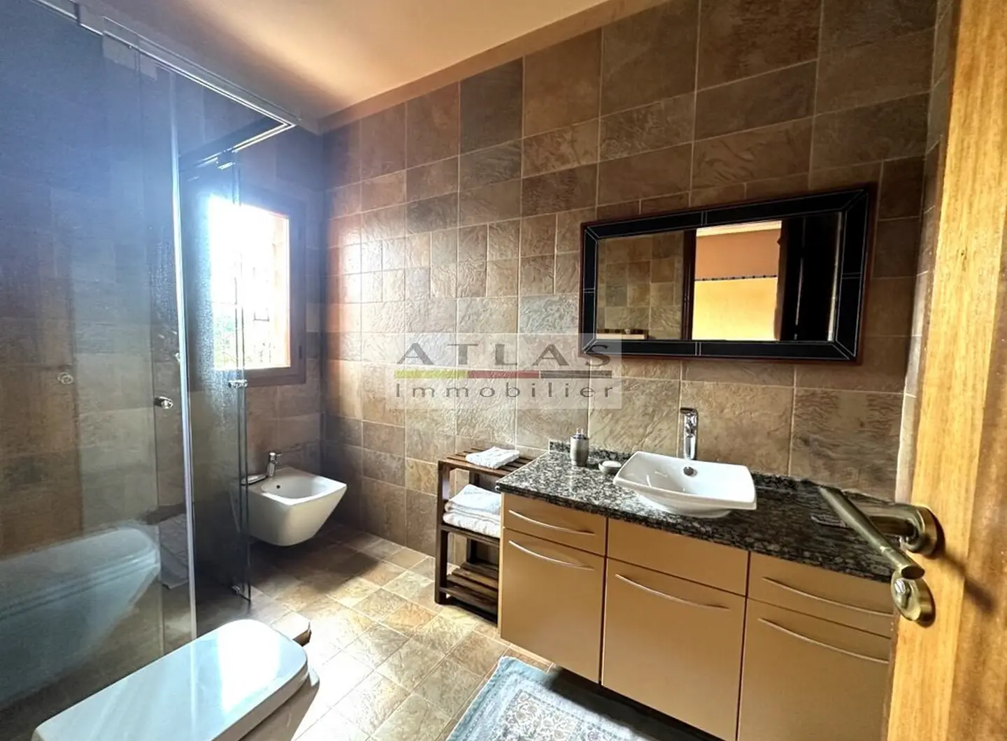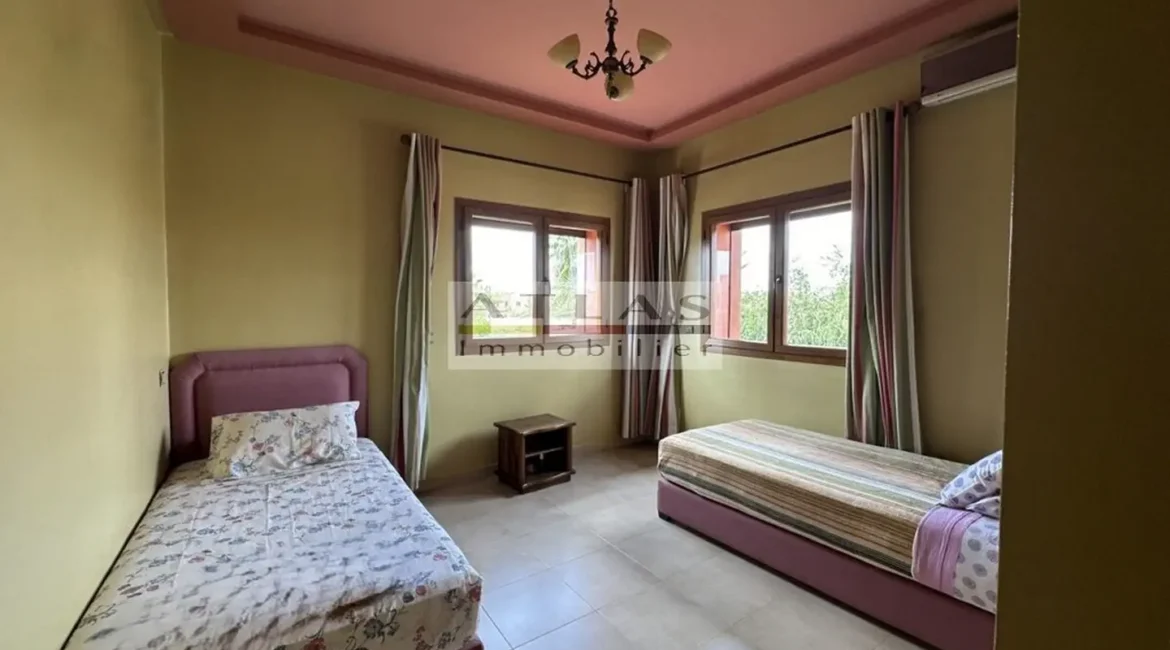 Située dans un quartier recherché à la sortie de Marrakech, cette magnifique villa contemporaine offre un cadre de vie exceptionnel, alliant confort, modernité et élégance. Le rez-de-chaussée vous accueille avec une vaste pièce à vivre en trois parties, baignée de lumière naturelle, et offrant une vue imprenable sur le jardin paysagé ainsi que sur la piscine privée. La grande cuisine entièrement aménagée et équipée vous permettra de préparer vos repas en toute convivialité, tandis que des toilettes pour invités ajoutent au confort. À l’étage, deux suites spacieuses, chacune avec sa salle de bain privative, ainsi que deux chambres supplémentaires partageant une salle de bain, offrent un espace de vie parfait pour toute la famille. Le sous-sol, entièrement aménagé avec une cour anglaise, dispose d’un espace de vie supplémentaire comprenant une terrasse, une cuisine, une chambre d’appoint, une buanderie et un garage. À l’extérieur, vous pourrez profiter d’une superbe piscine privée, accompagnée d’une douche extérieure et d’un solarium, l’endroit idéal pour se détendre sous le soleil de Marrakech. Ne manquez pas cette opportunité unique de vivre dans un cadre paisible et élégant, à seulement quelques minutes du centre de Marrakech.
