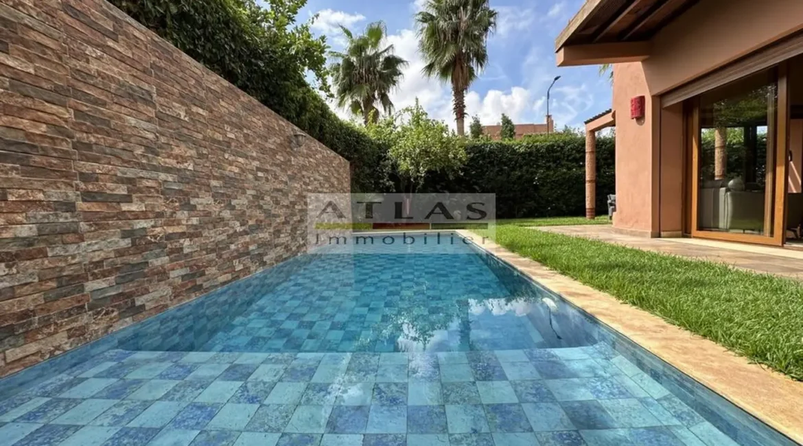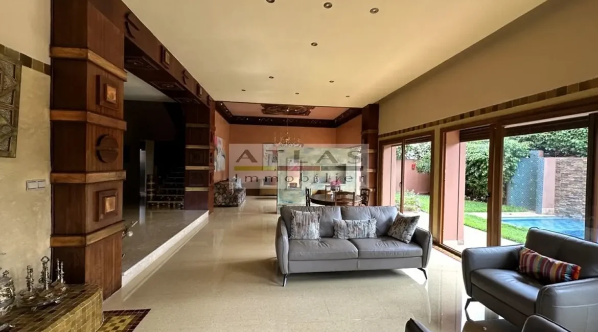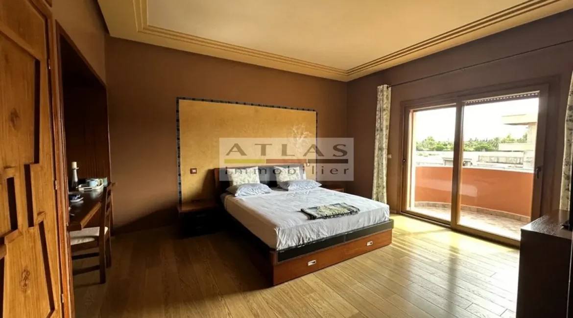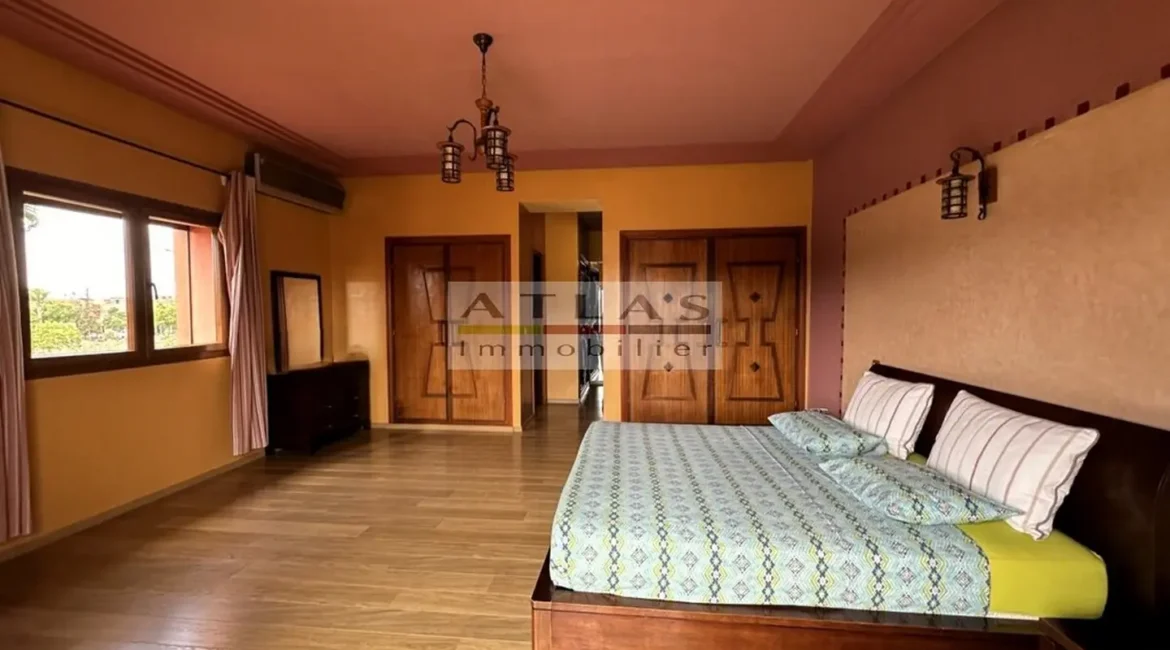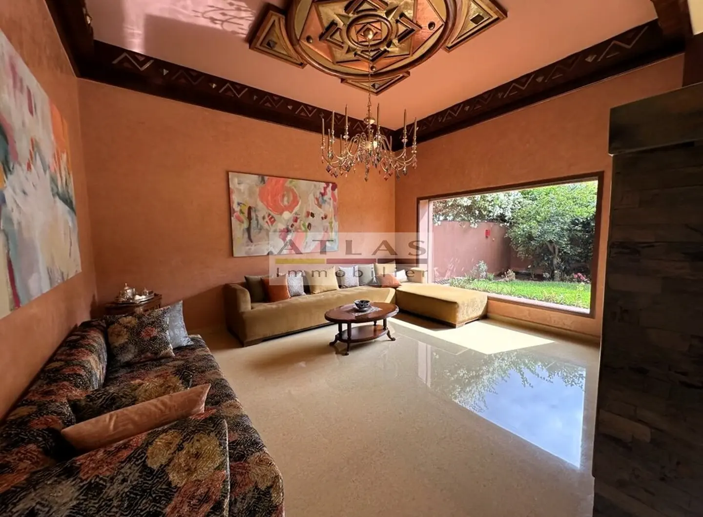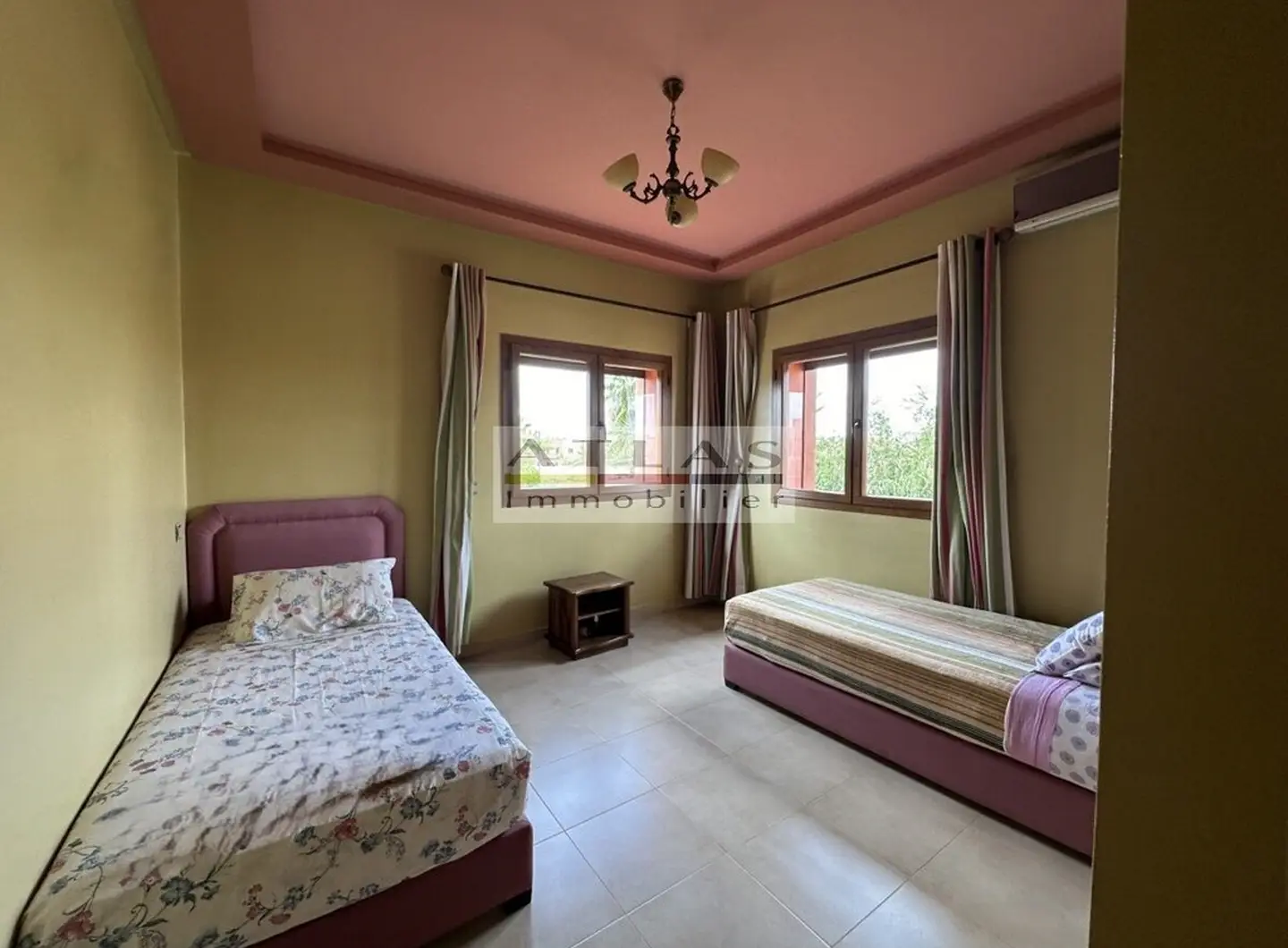 Située dans un quartier recherché à la sortie de Marrakech, cette magnifique villa contemporaine offre un cadre de vie exceptionnel, alliant confort, modernité et élégance. Le rez-de-chaussée vous accueille avec une vaste pièce à vivre en trois parties, baignée de lumière naturelle, et offrant une vue imprenable sur le jardin paysagé ainsi que sur la piscine privée. La grande cuisine entièrement aménagée et équipée vous permettra de préparer vos repas en toute convivialité, tandis que des toilettes pour invités ajoutent au confort. À l’étage, deux suites spacieuses, chacune avec sa salle de bain privative, ainsi que deux chambres supplémentaires partageant une salle de bain, offrent un espace de vie parfait pour toute la famille. Le sous-sol, entièrement aménagé avec une cour anglaise, dispose d’un espace de vie supplémentaire comprenant une terrasse, une cuisine, une chambre d’appoint, une buanderie et un garage. À l’extérieur, vous pourrez profiter d’une superbe piscine privée, accompagnée d’une douche extérieure et d’un solarium, l’endroit idéal pour se détendre sous le soleil de Marrakech. Ne manquez pas cette opportunité unique de vivre dans un cadre paisible et élégant, à seulement quelques minutes du centre de Marrakech.