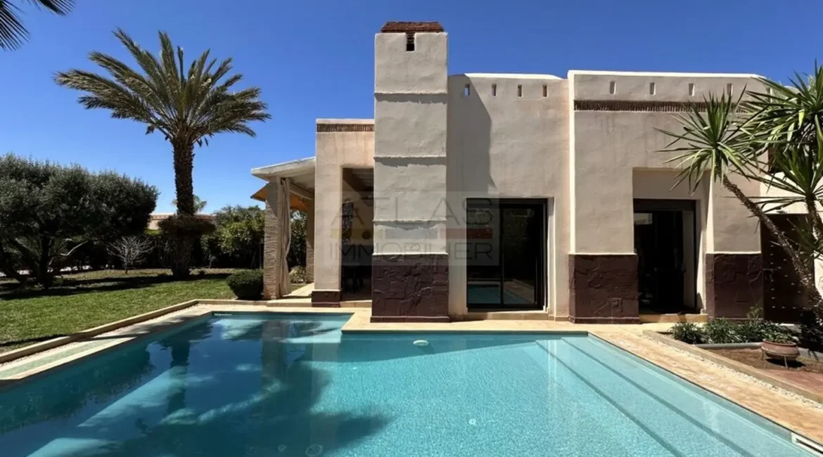 Villa à 20 minutes de Marrakech, résidence sécurisée, piscine privée, jardin entretenu, trois chambres, trois salles de bains, cuisine extérieure, climatisation centralisée, chauffe-eau solaire, fibre optique, villa meublée, investissement locatif Marrakech, propriété à vendre Marrakech