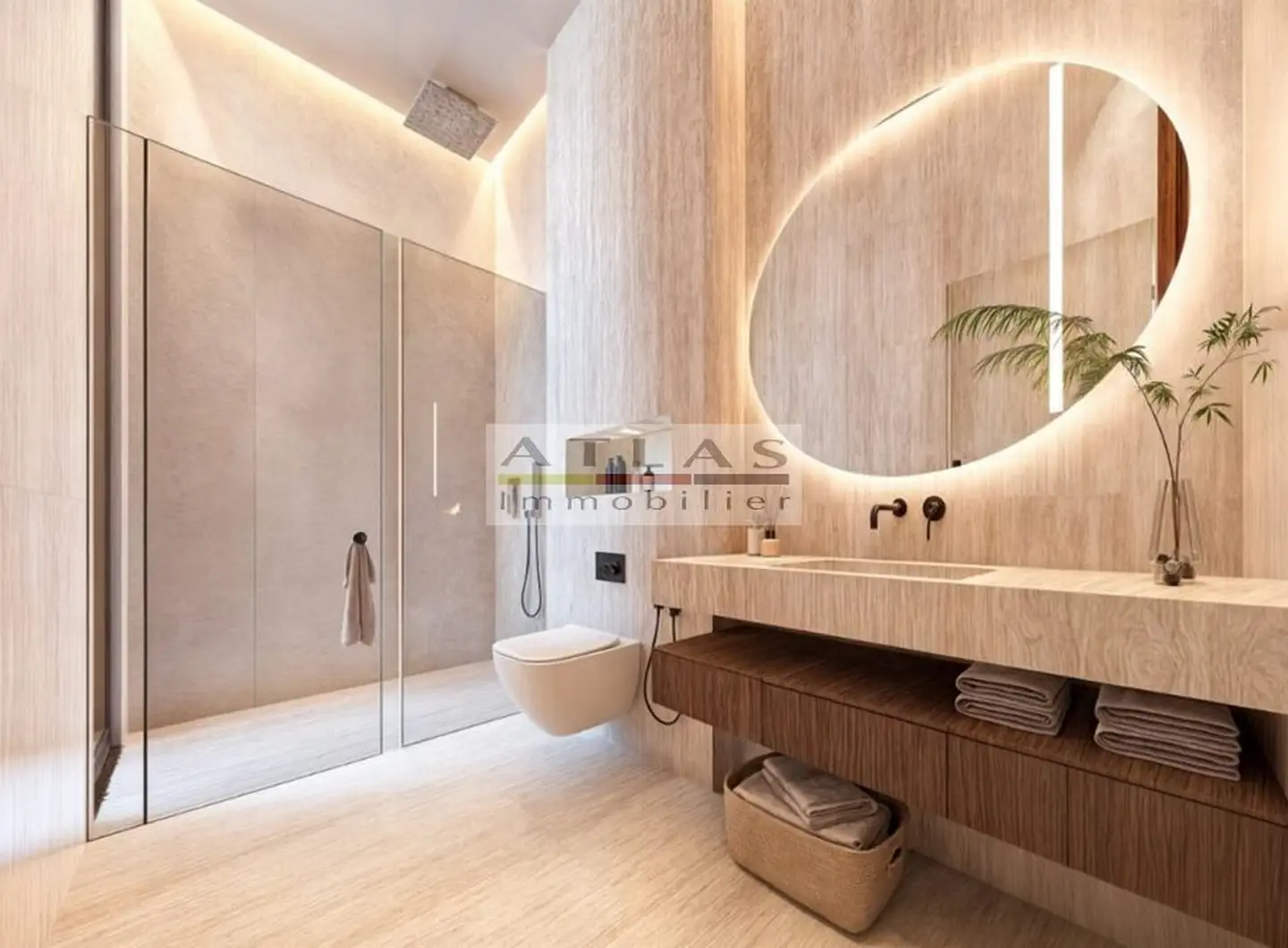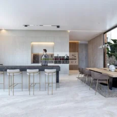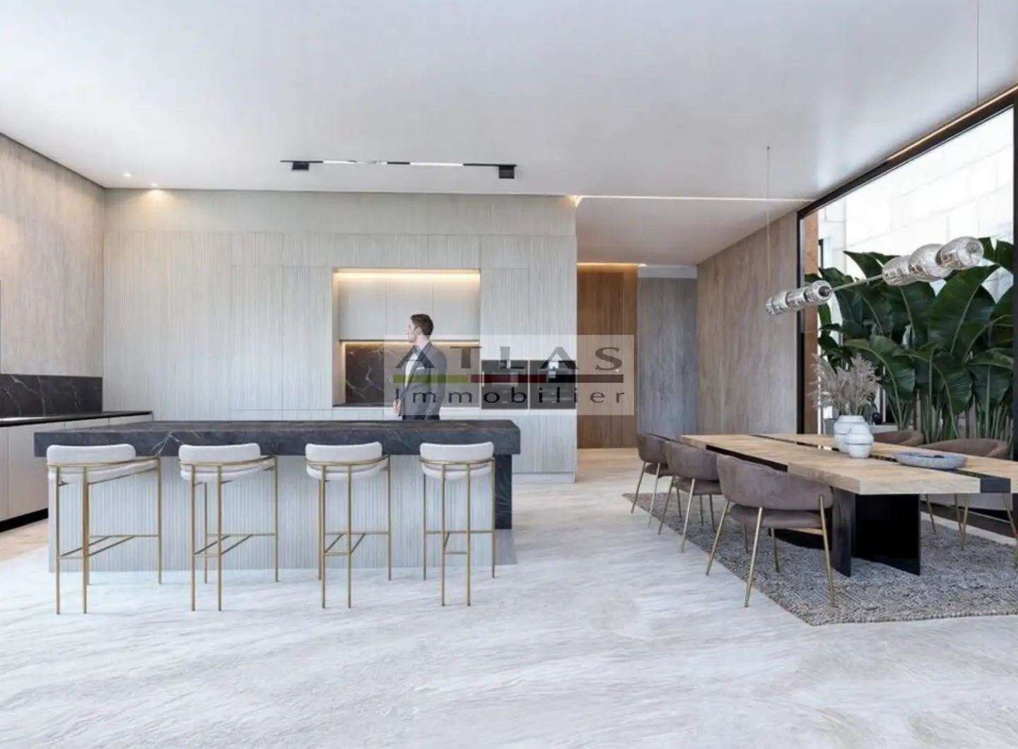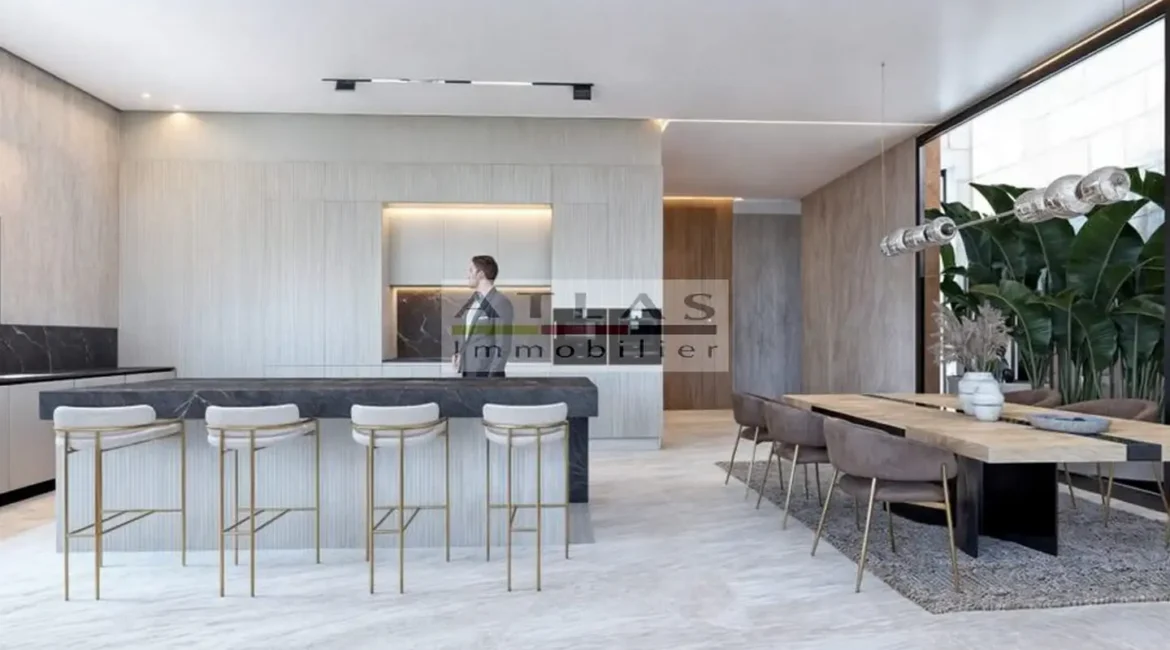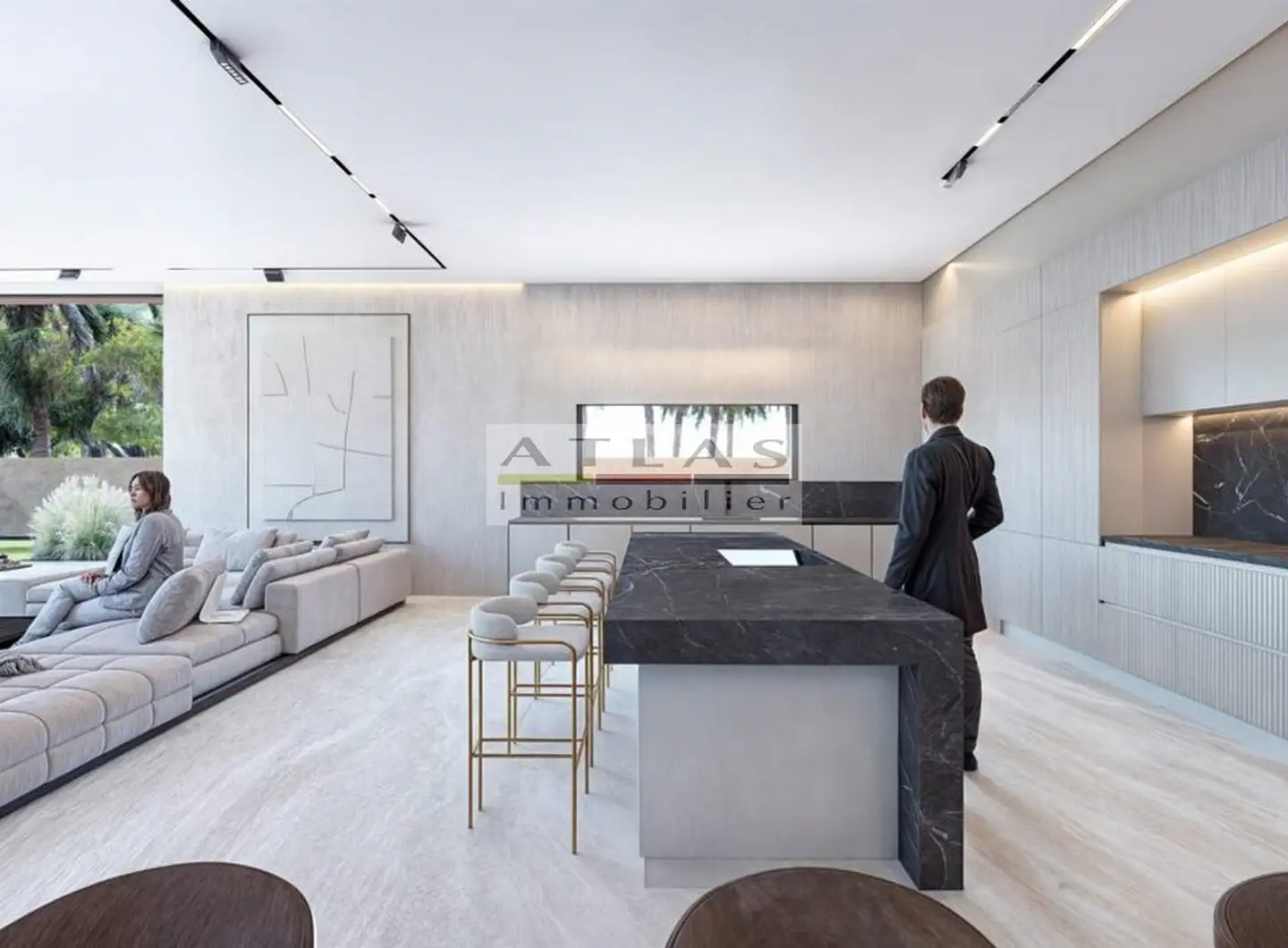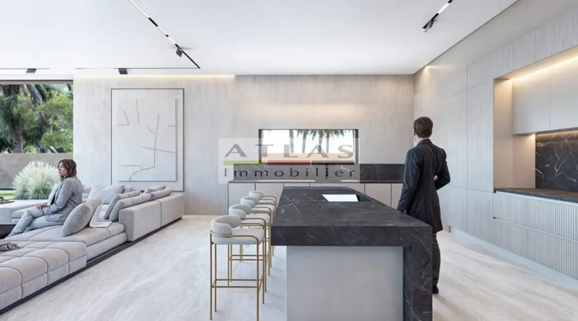La cuisine, équipée de prestations haut de gamme, peut être aménagée en version ouverte ou fermée, selon vos préférences. Le vaste salon, inondé de lumière naturelle grâce à de grandes baies vitrées en double vitrage, s’ouvre directement sur une superbe piscine et un jardin verdoyant, créant une atmosphère propice à la détente et à la convivialité.