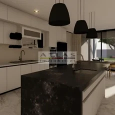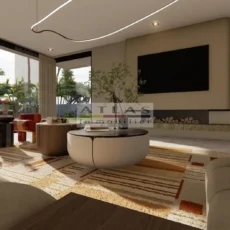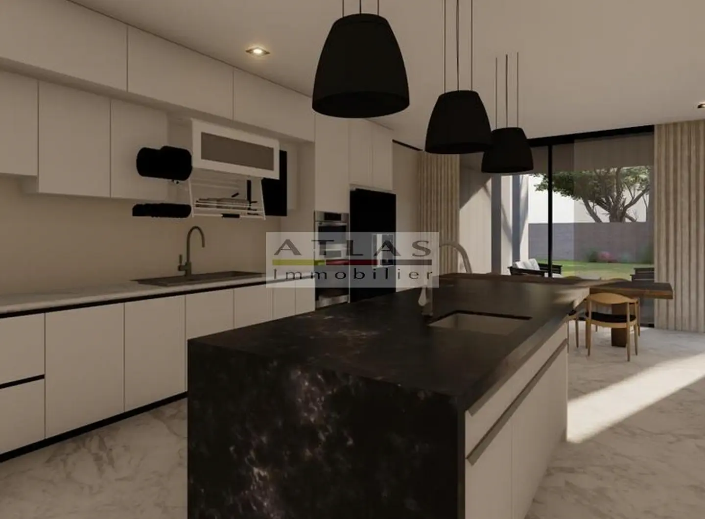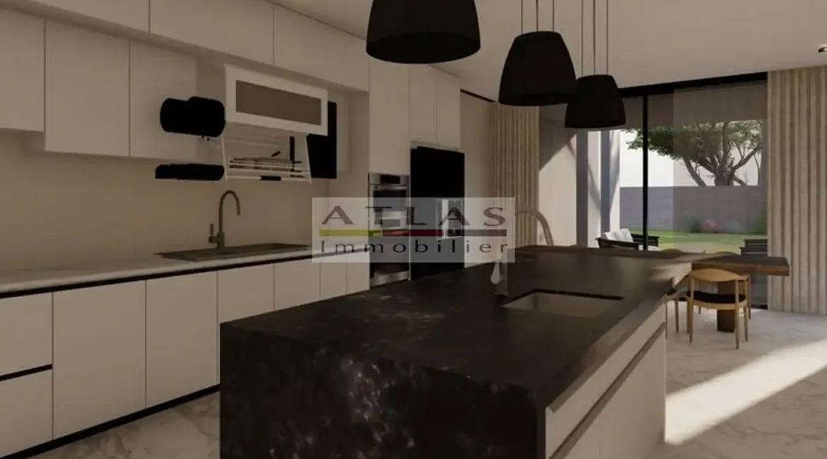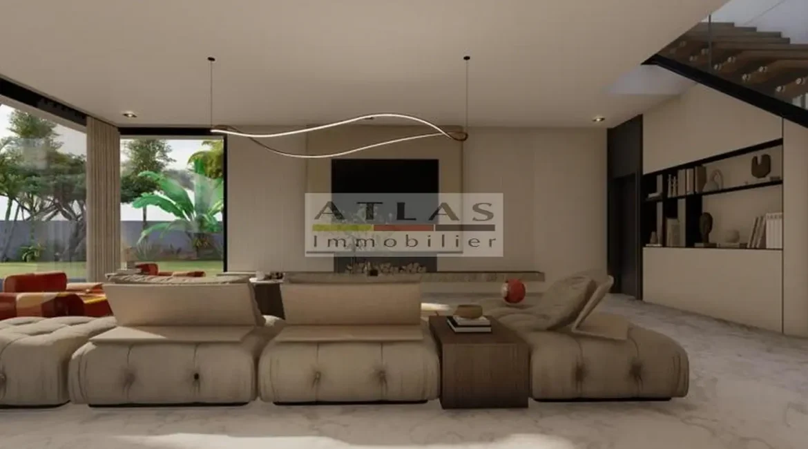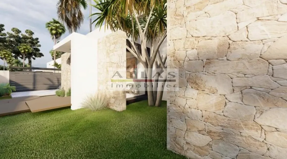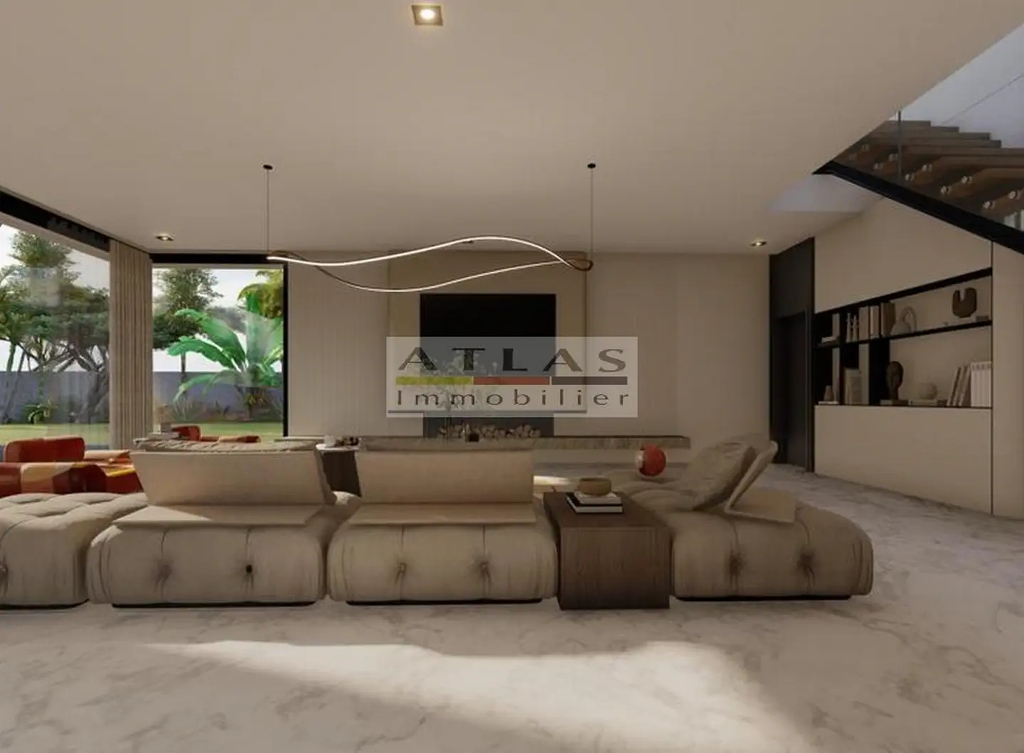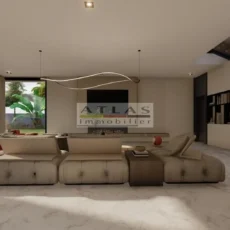 Les espaces intérieurs séduisent par leurs volumes remarquables, notamment une entrée lumineuse avec porte pivot toute hauteur, un salon et une salle à manger de 100 m² avec 3 mètres de hauteur sous plafond, de larges baies vitrées en aluminium, un escalier suspendu élégant, ainsi qu’une cuisine équipée de 50 m² avec îlot central et buanderie attenante. À l’étage, les suites bénéficient de dressings, placards intégrés, salles de bains privatives et coin salon. La master suite, dotée de son patio privé, incarne le raffinement absolu.